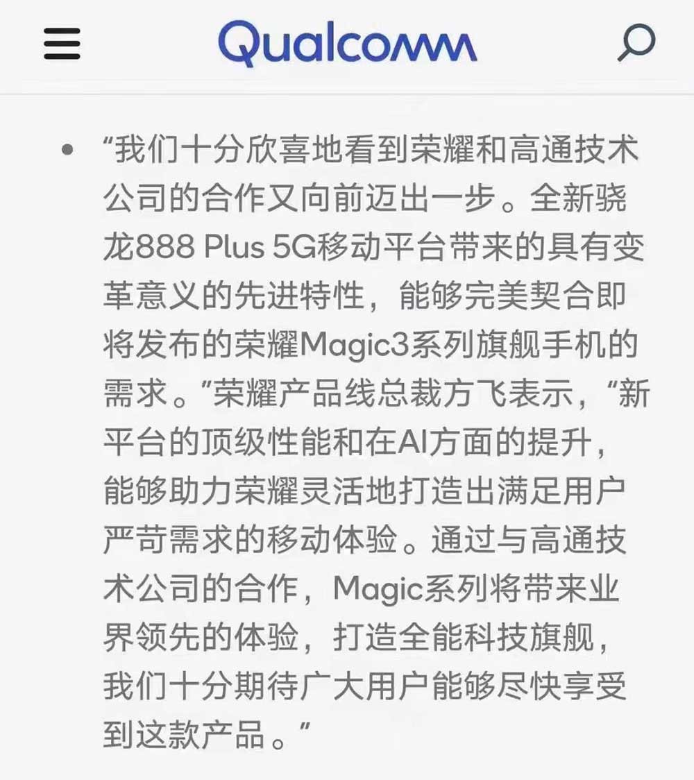 以上这些高管发言均来自于骁龙888 Plus的新闻稿,那么究竟谁会首发呢?目前业界盛传其首发厂商会是荣耀,一来是在近日首发了高通全新的7系处理器骁龙778G,二来它也是唯一一家透露具体机型的厂商,其实这款芯片非常考验厂商们的调教能力,谁能更好的压制住这头凶猛的“火龙”呢?我们拭目以待。