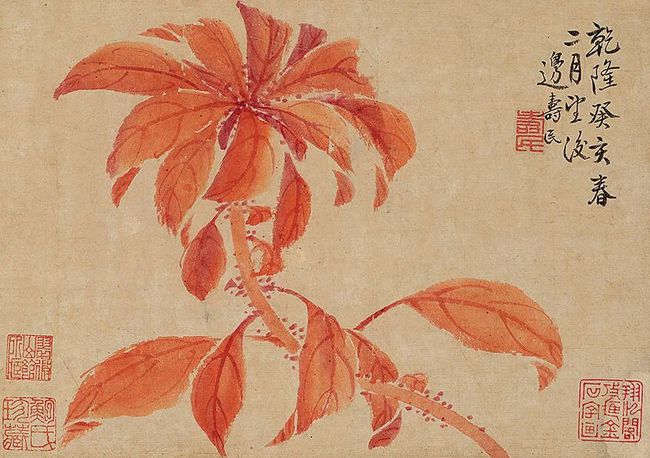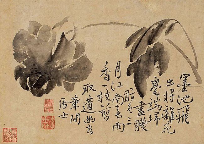 题识:墨池飞出将离花,毫端归尽胭脂色。三月江南春雨香,一枝剪取遗幽客。苇间居士。