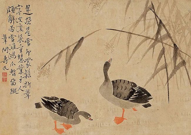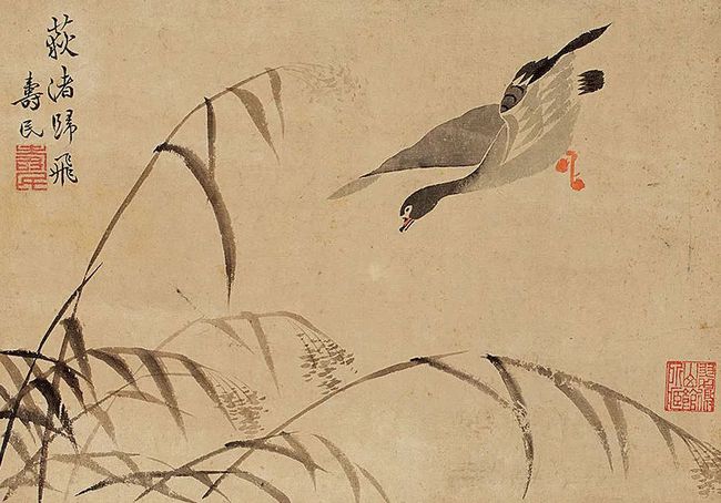 题识:是风是雪却蒙松,折苇寒波复几重。慧业才人颇解否,雪滩鸿爪暂留踪。苇间寿民。