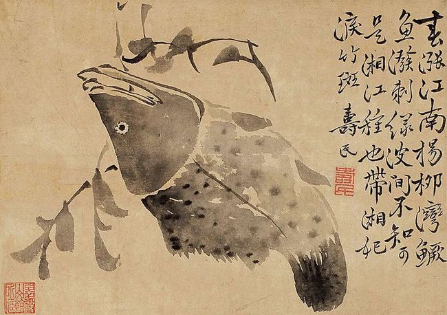 题识:春涨江南杨柳湾,鳜鱼泼刺绿波间。不知可是湘江种,也带湘妃泪竹斑。寿民。