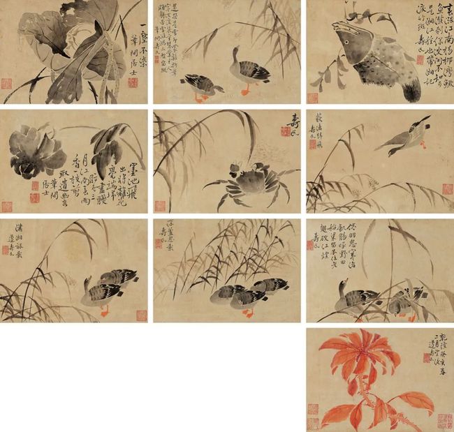 此《杂画册》为边寿民乾隆癸亥(1743年),或泼墨写意,笔法潇洒,形象简括、生动,或淡墨勾勒,干笔皴擦,富有立体感,画面大片空白,形象突出,乃画家佳作。