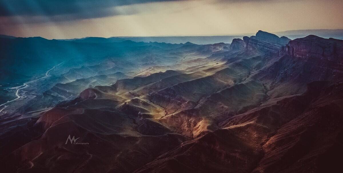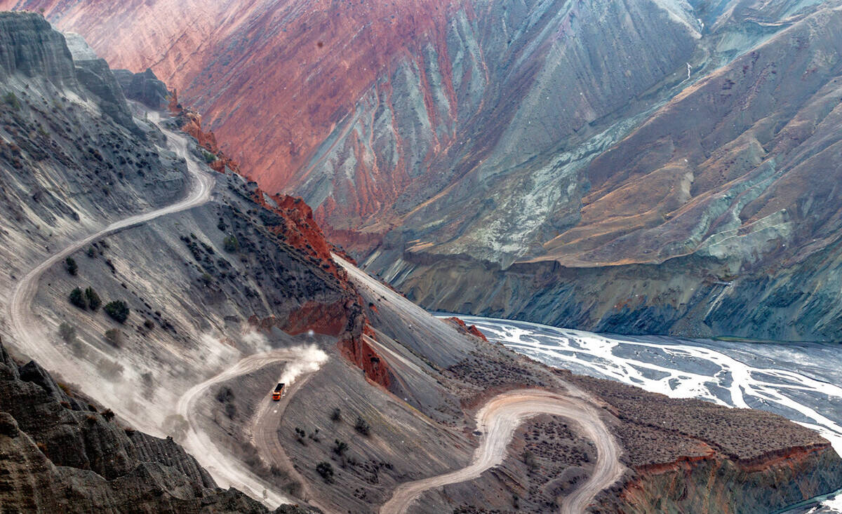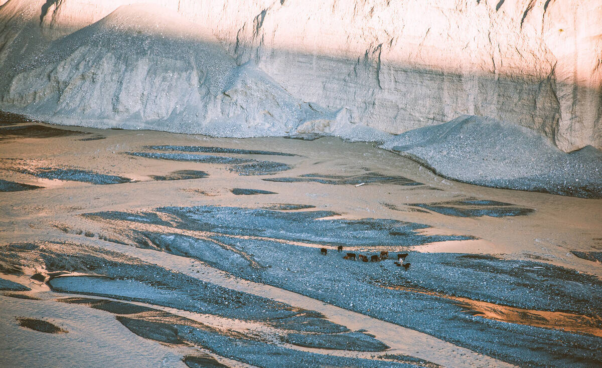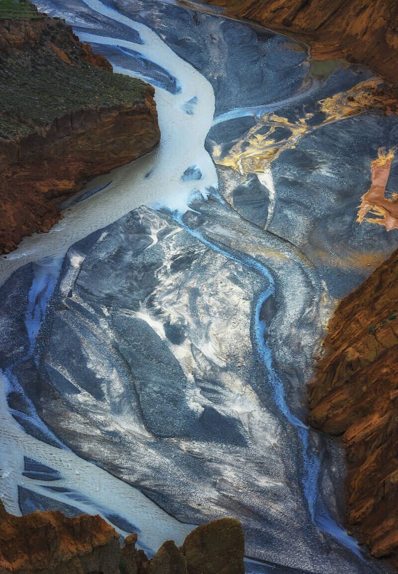 河流将不同颜色的砂岩和泥岩冲刷溶解,形成了一副大地抽象画。