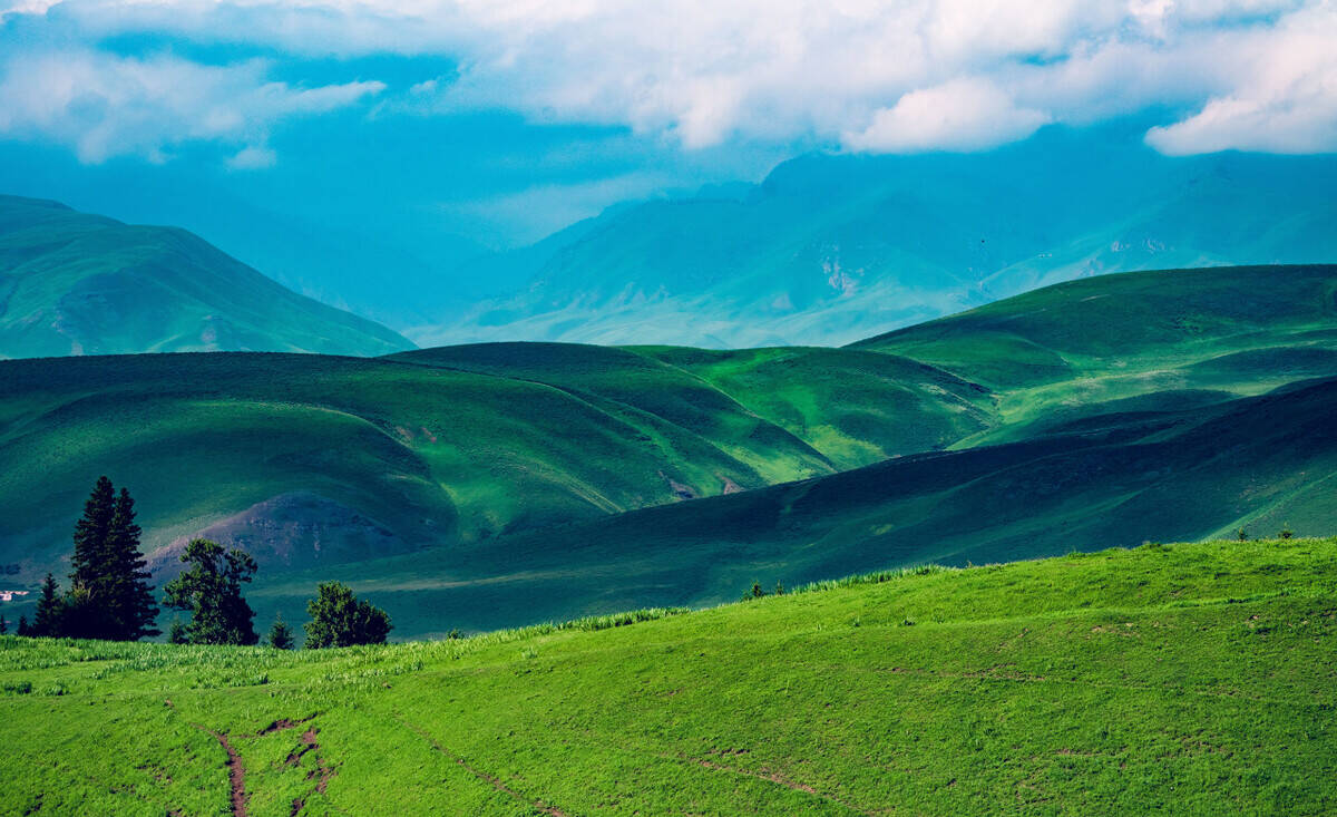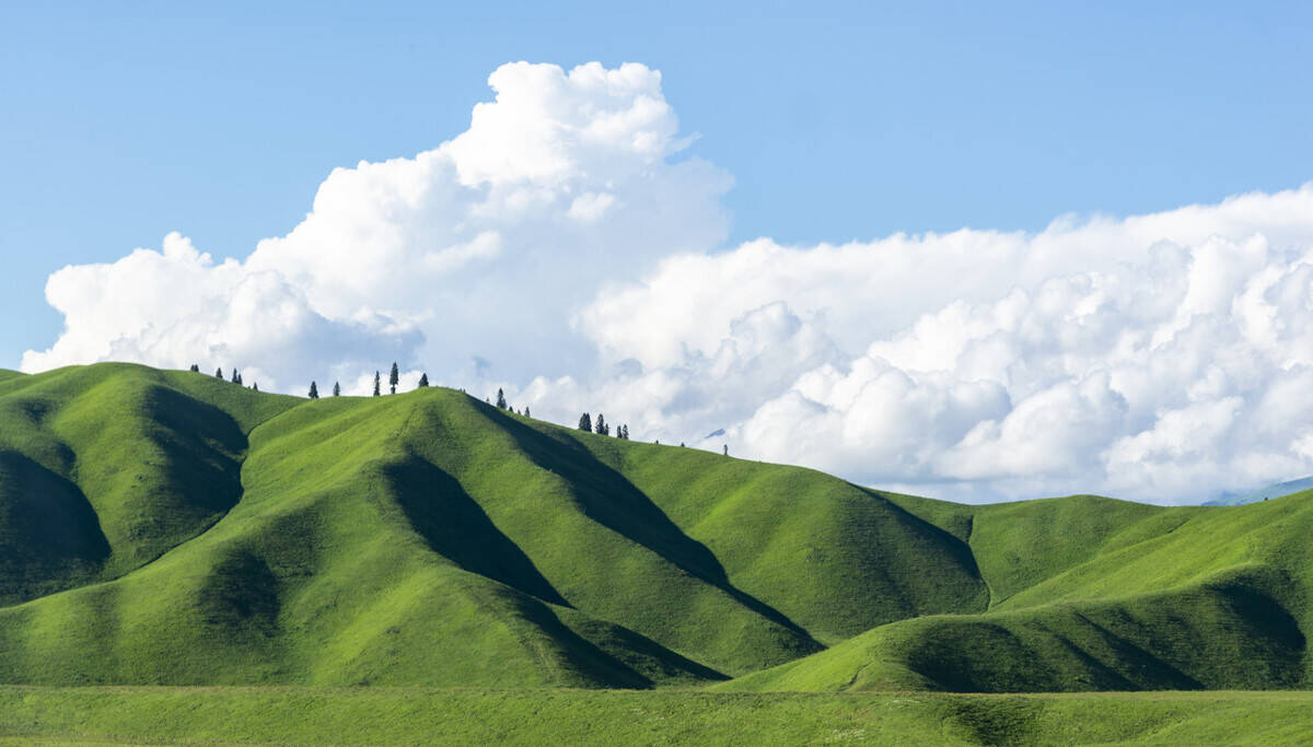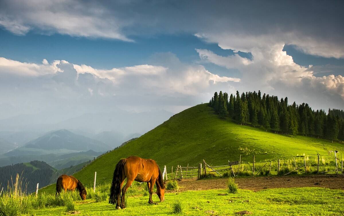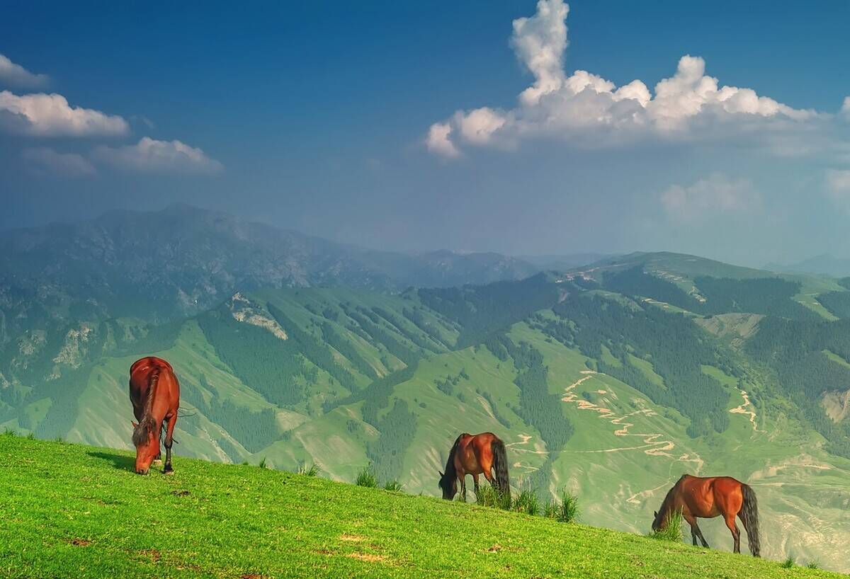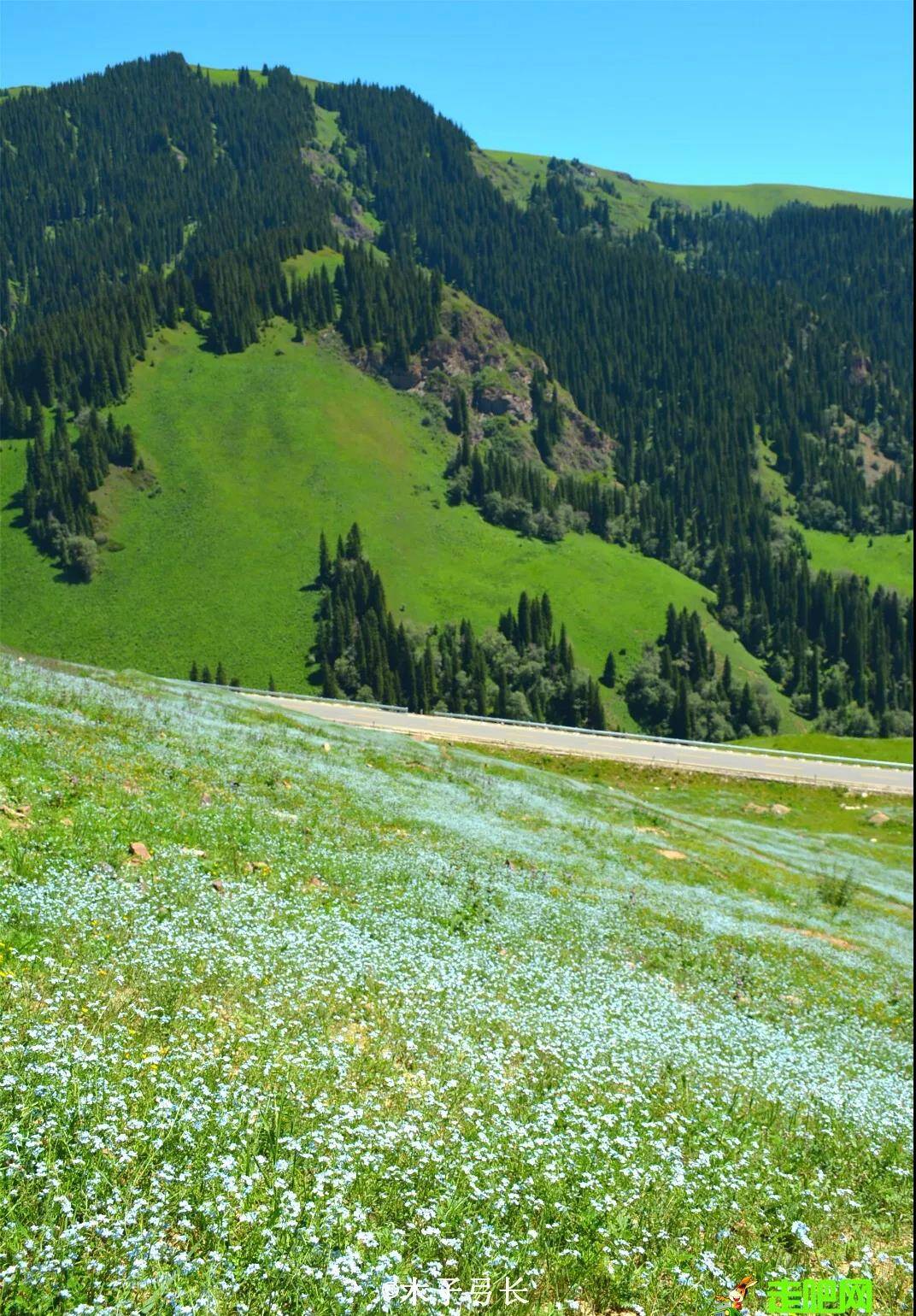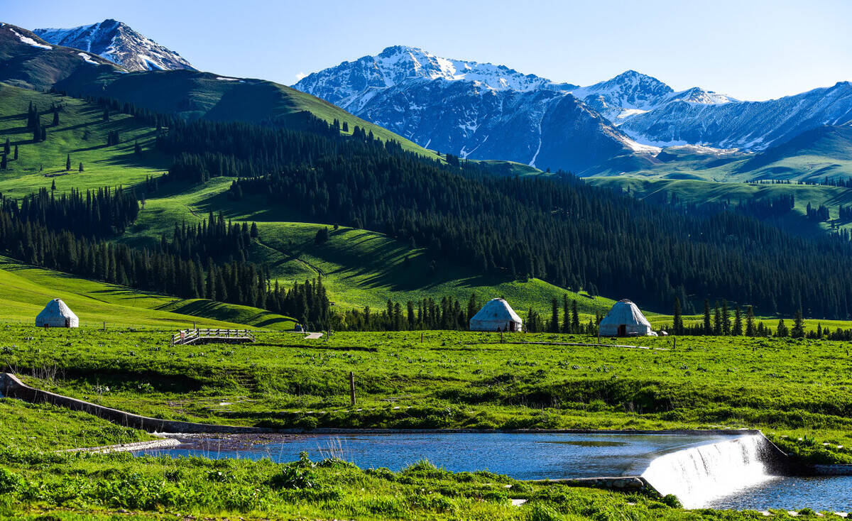 鹿角湾,隐藏在天山北麓的空中牧场,蓝天、白云、雪山勾勒出一个童话国度。