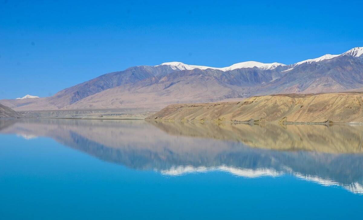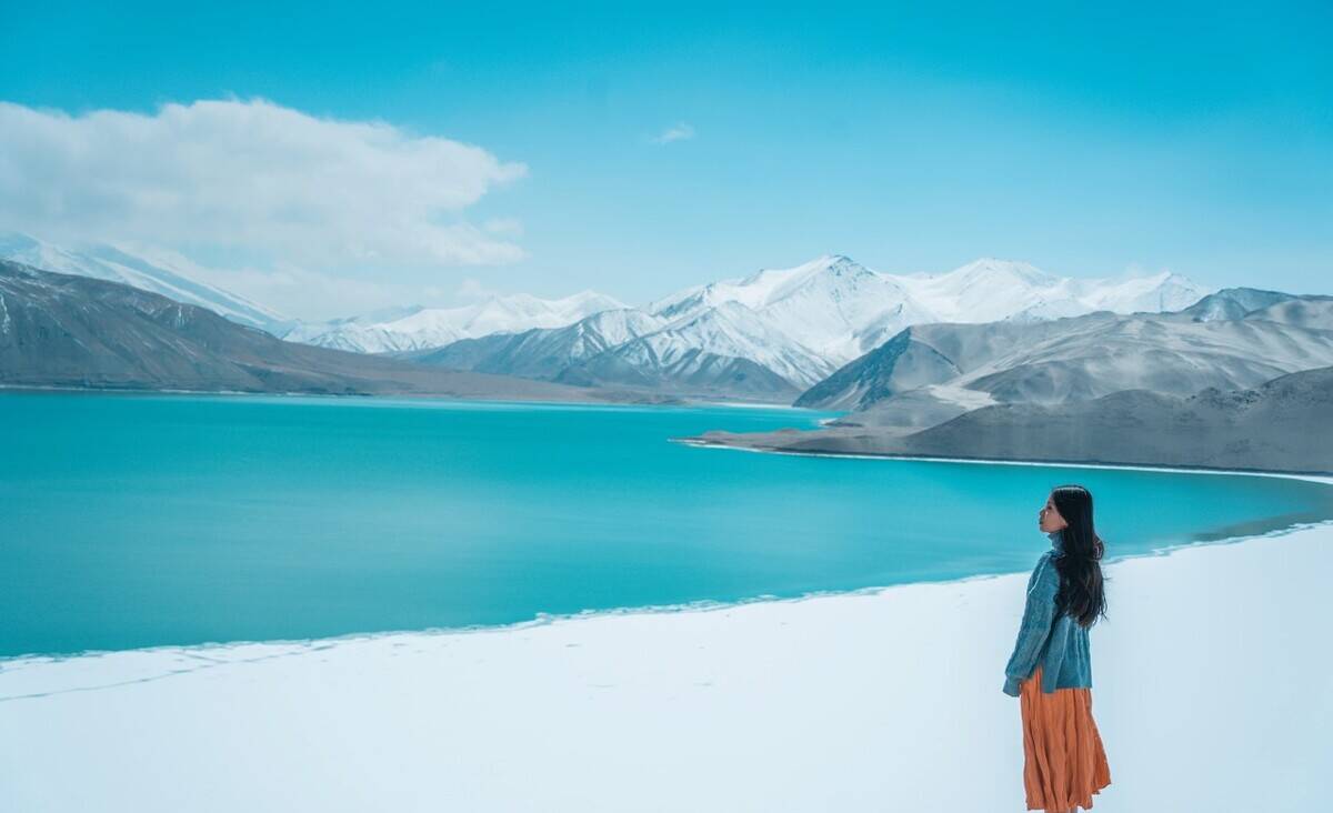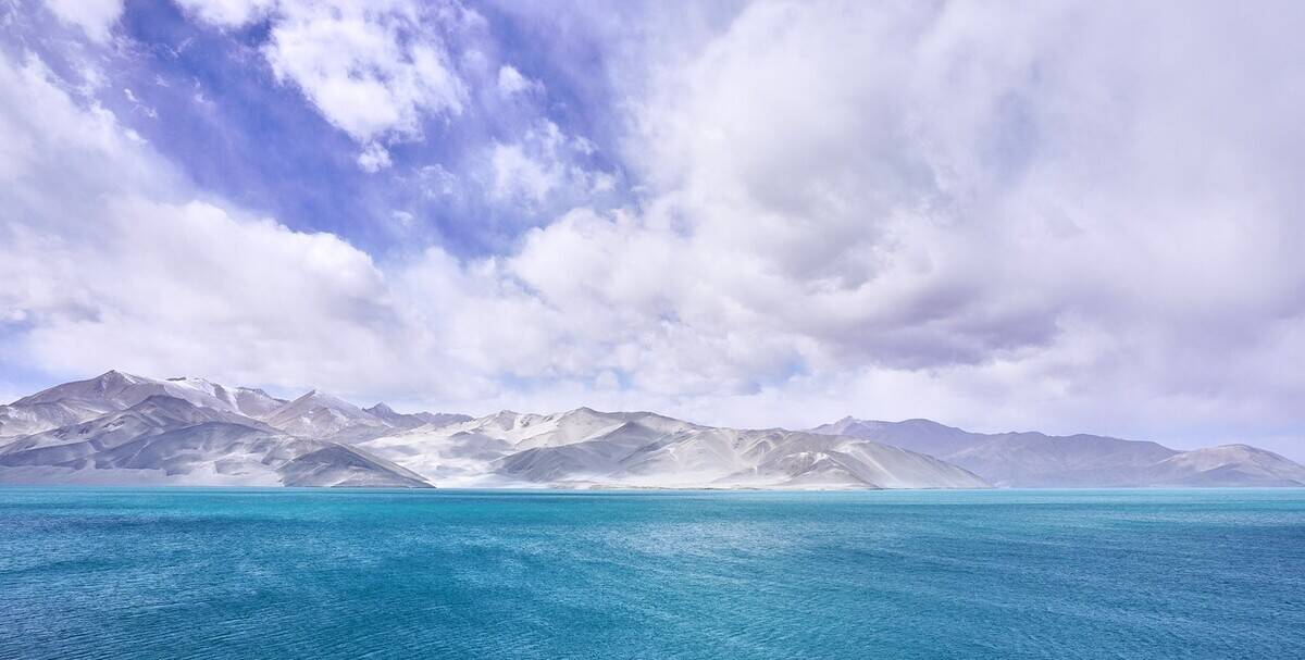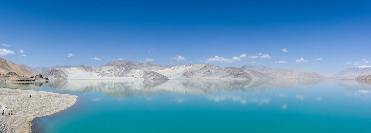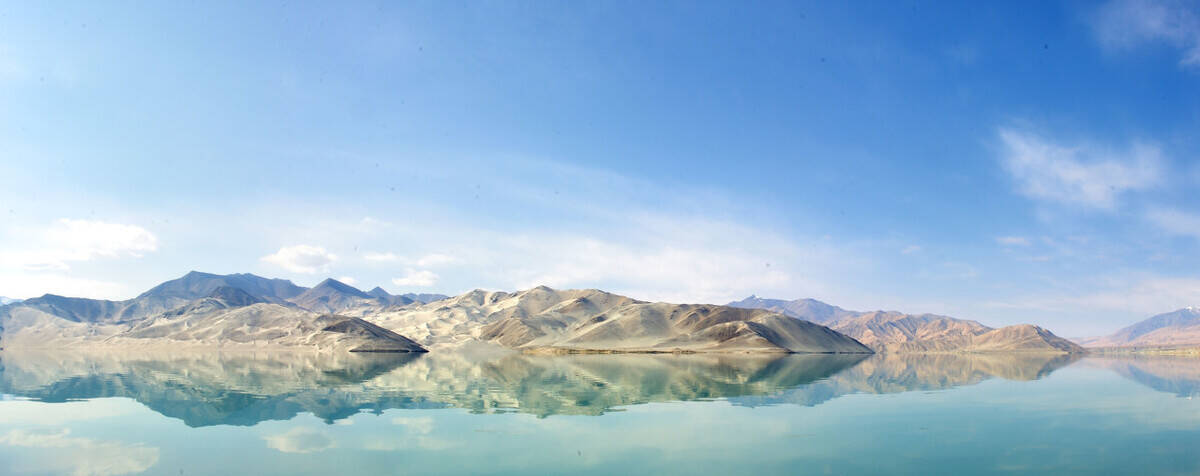 喀拉库勒湖的湖水在一天之中会不停地变幻着各种色彩,朝霞漫天、夕阳西下时,一片金红;天晴时,澄澈碧蓝;每逢电闪雷鸣之际,就瞬间换上一副幽黯面孔。