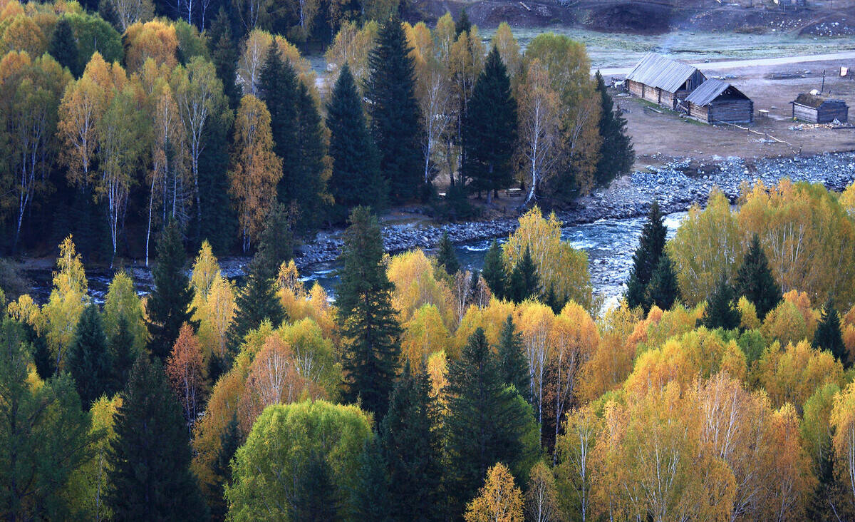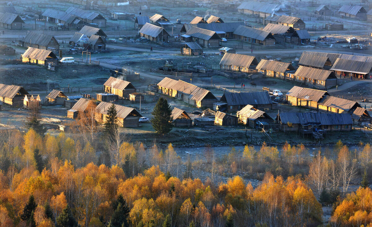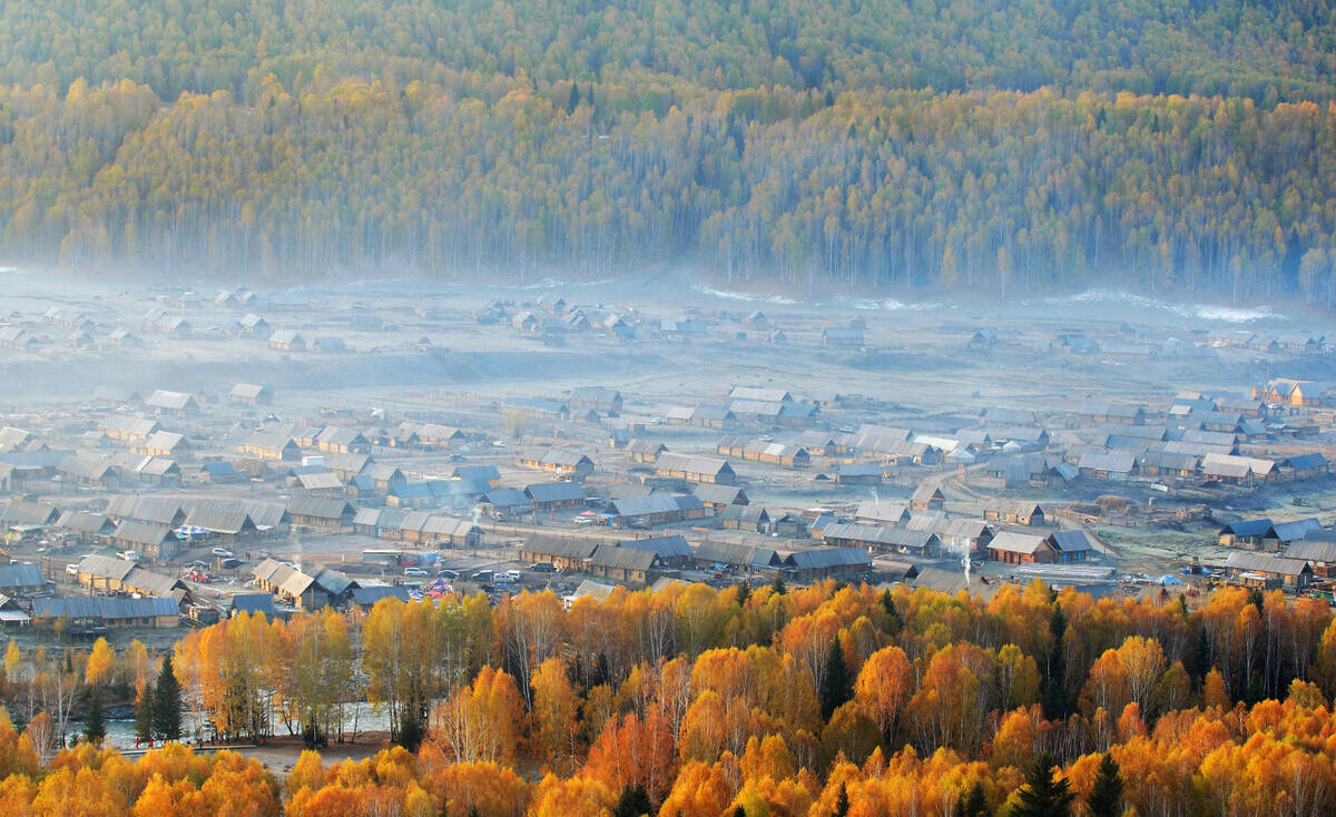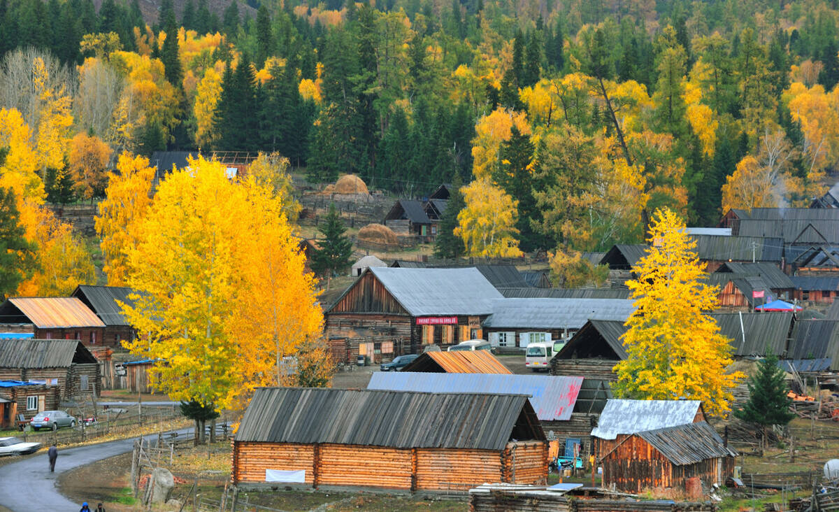 秋天,白哈巴村无论从任何一个位置放眼所望,都是热烈而明朗的金黄色——小河、木房、炊烟、桦林及小道上放牧的人们。