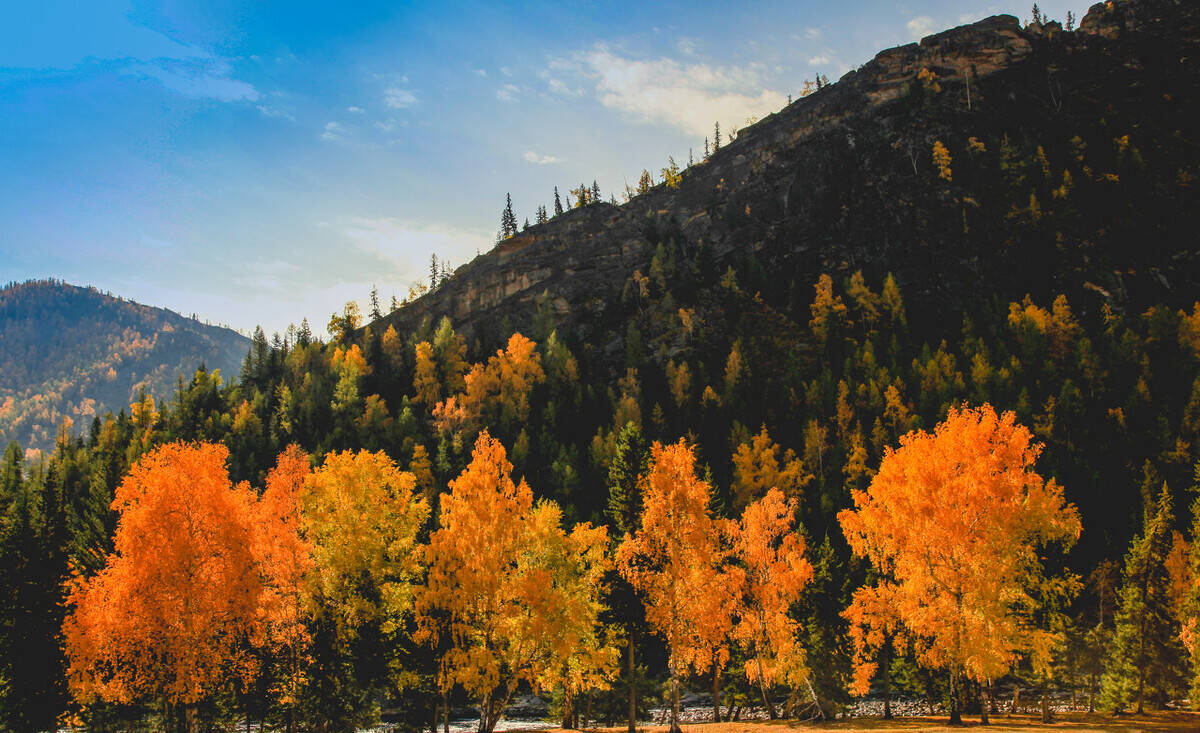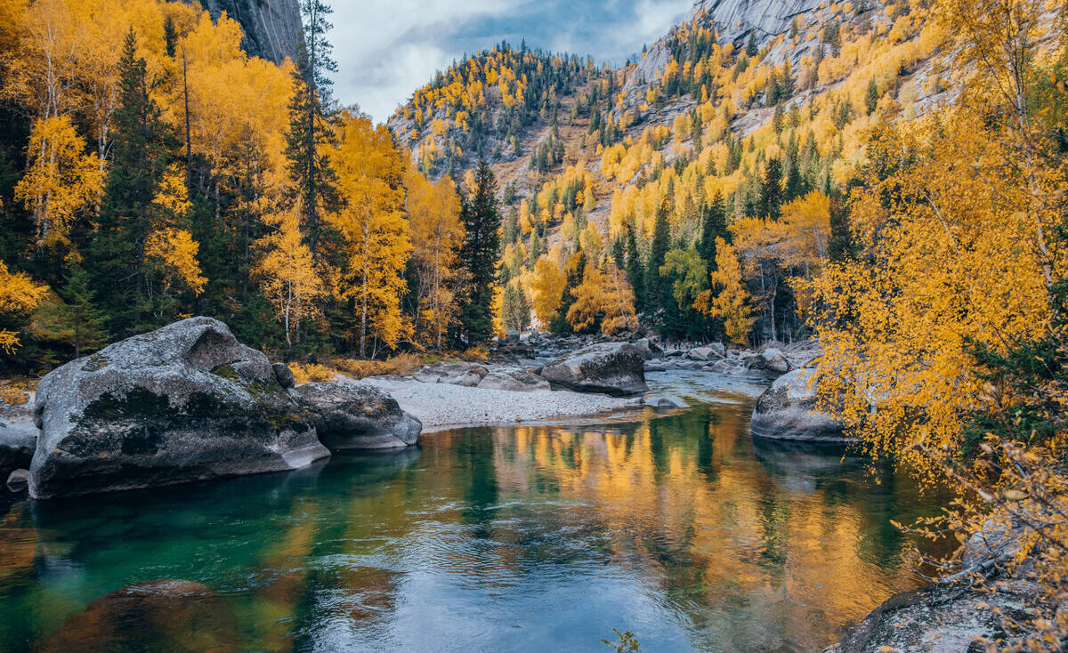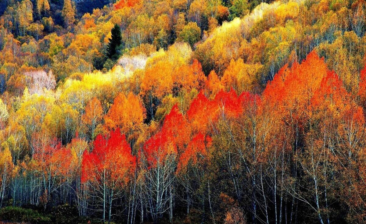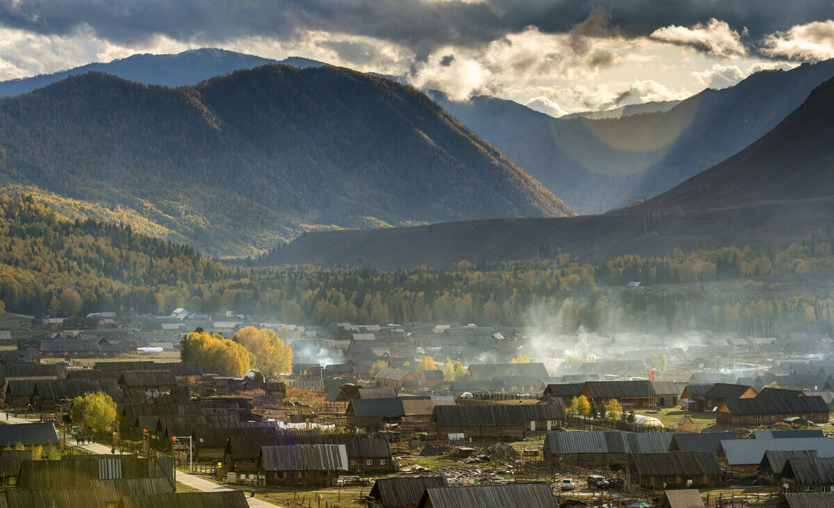 秋天,白哈巴村无论从任何一个位置放眼所望,都是热烈而明朗的金黄色——小河、木房、炊烟、桦林及小道上放牧的人们。
