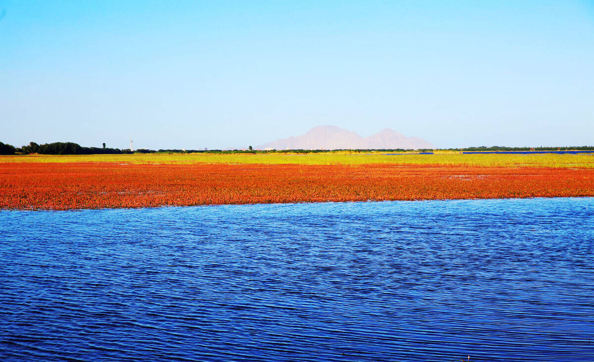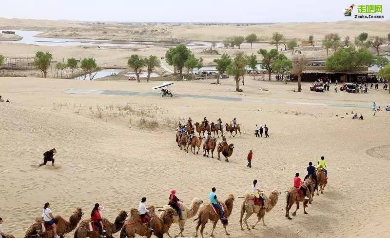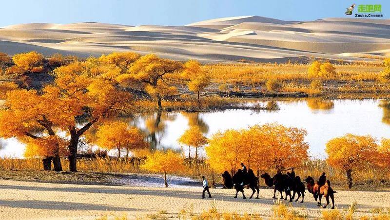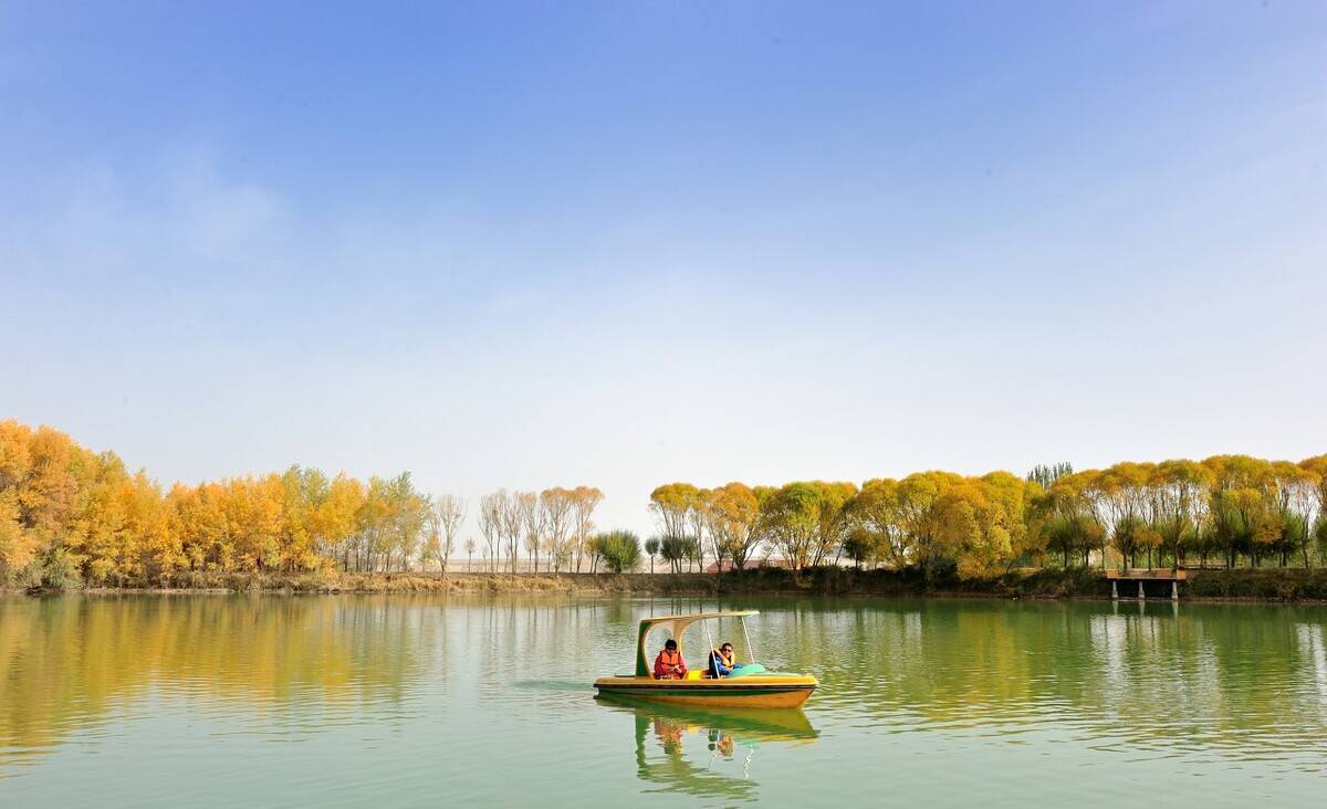 白沙湖景致独特,远处的金色鸣沙山倒映在碧绿的湖面上,与各类树木交相辉映,活脱脱一个“塞北小江南”。