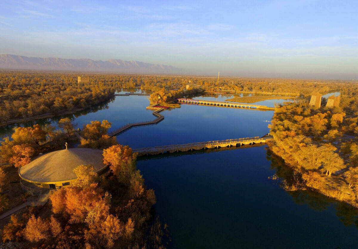 秋色浸染后,“胡杨、水、绿洲、戈壁”四位一体的独特自然风貌,向人们展示了一副塞外边疆独有的画卷。