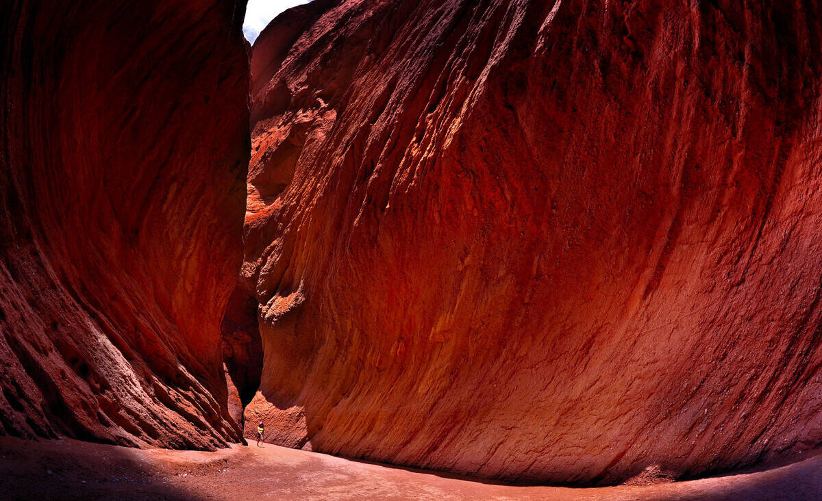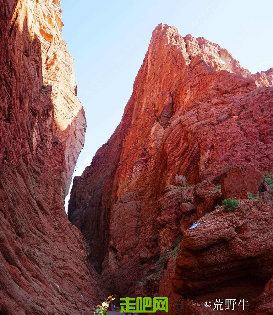 峡谷两侧红褐色岩石经过大自然亿万年的雕刻而成,峡谷曲径通幽,山峦直插云天,阳光直射下,犹如一簇簇正在燃烧着的红色火焰。