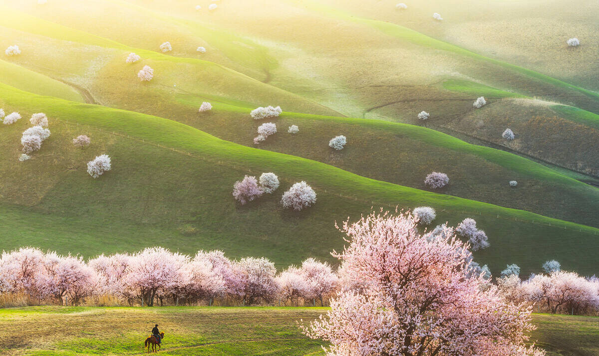 天堂很远,昭苏很近。每逢盛开时节,昭苏草原上的油菜花,就犹如一条条金色的编织带,编造着最美丽的人间天堂。