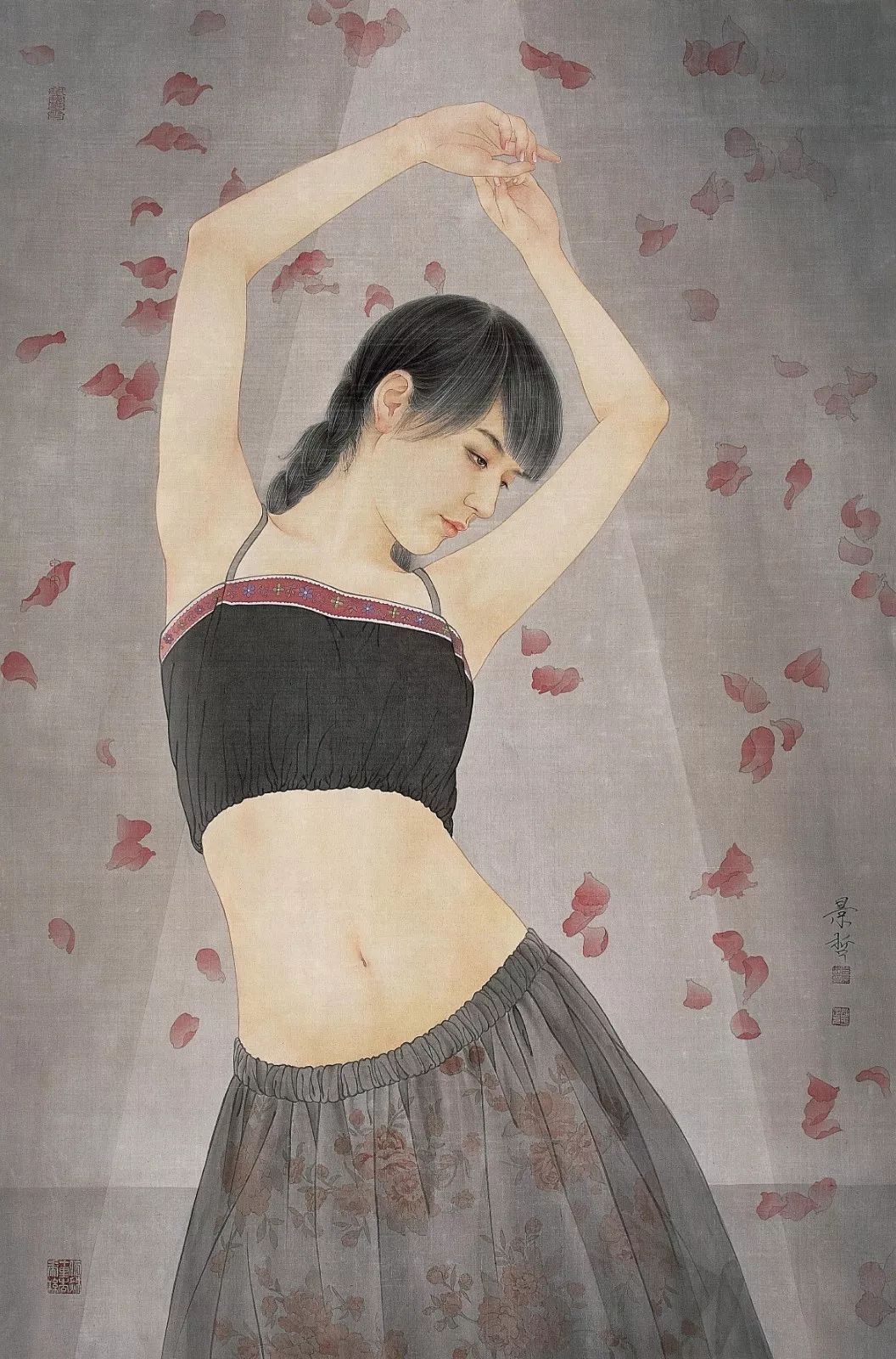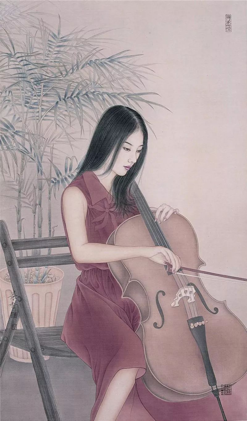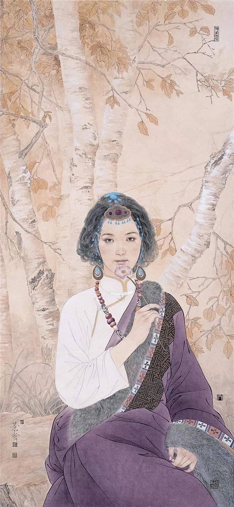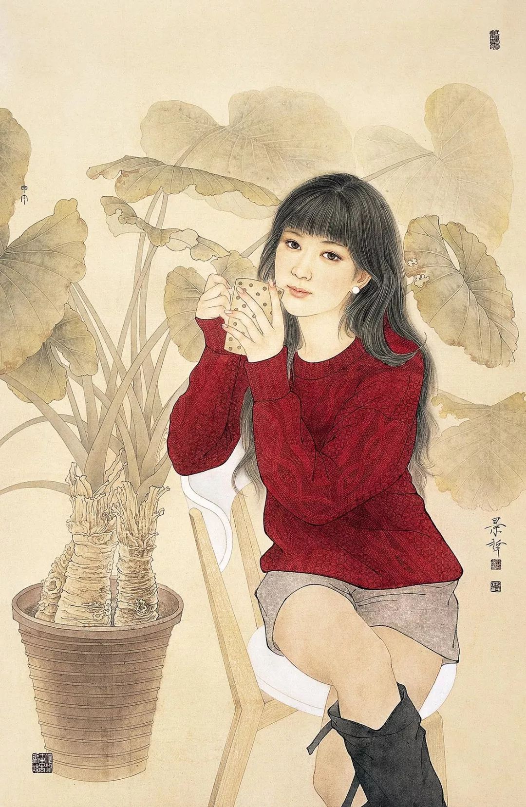 崔景哲的现代仕女画的确富于情韵,因为他的艺术承继了我国绘画“缘情”的传统,画中的情事真情、意是真意,他画的是自己最真诚的内心世界,甚至是他情感与志趣的心性提升。