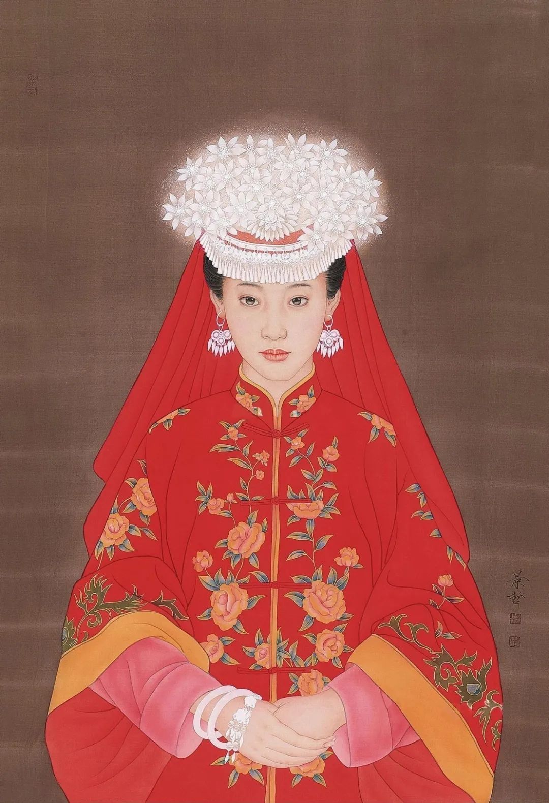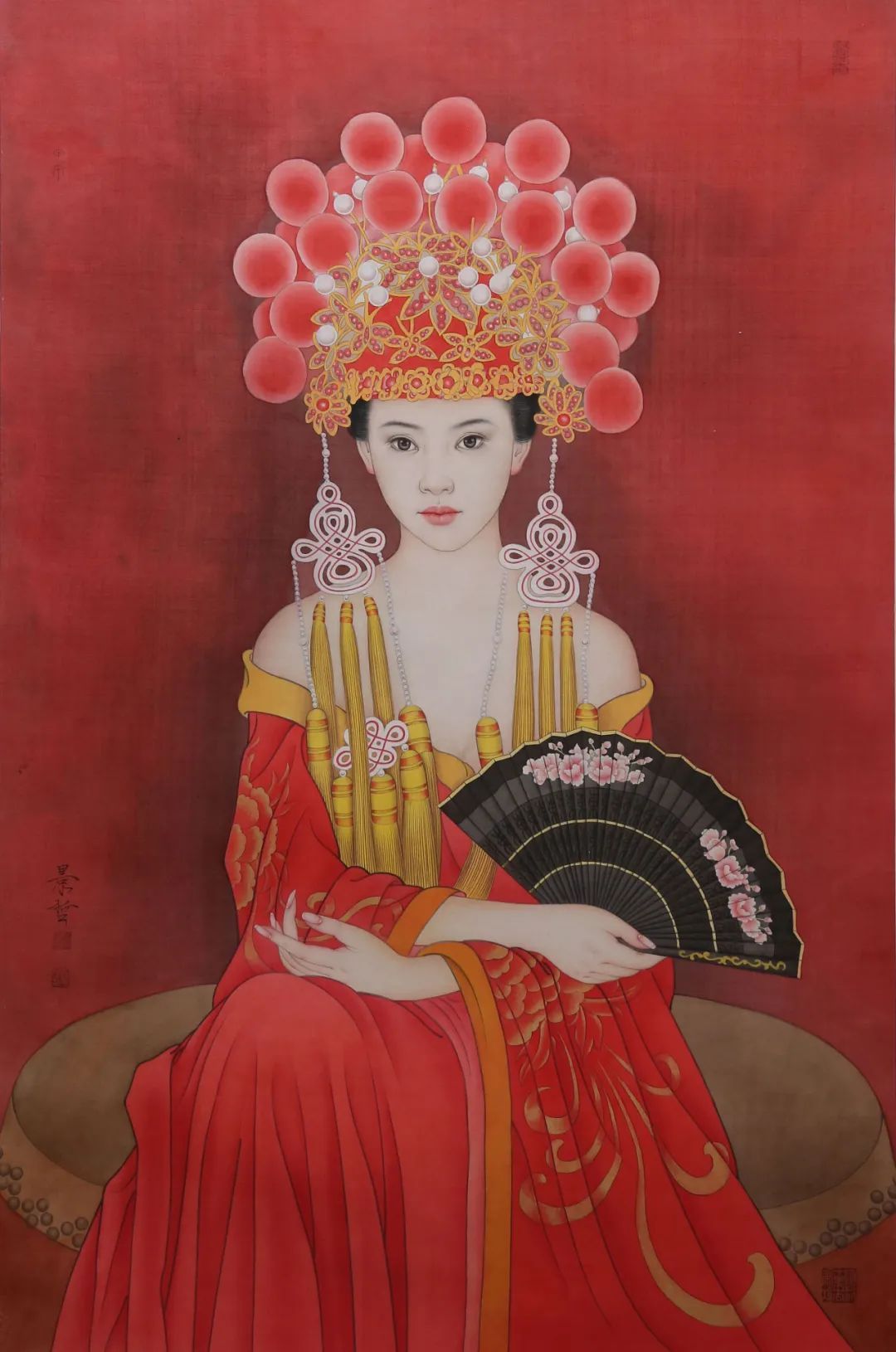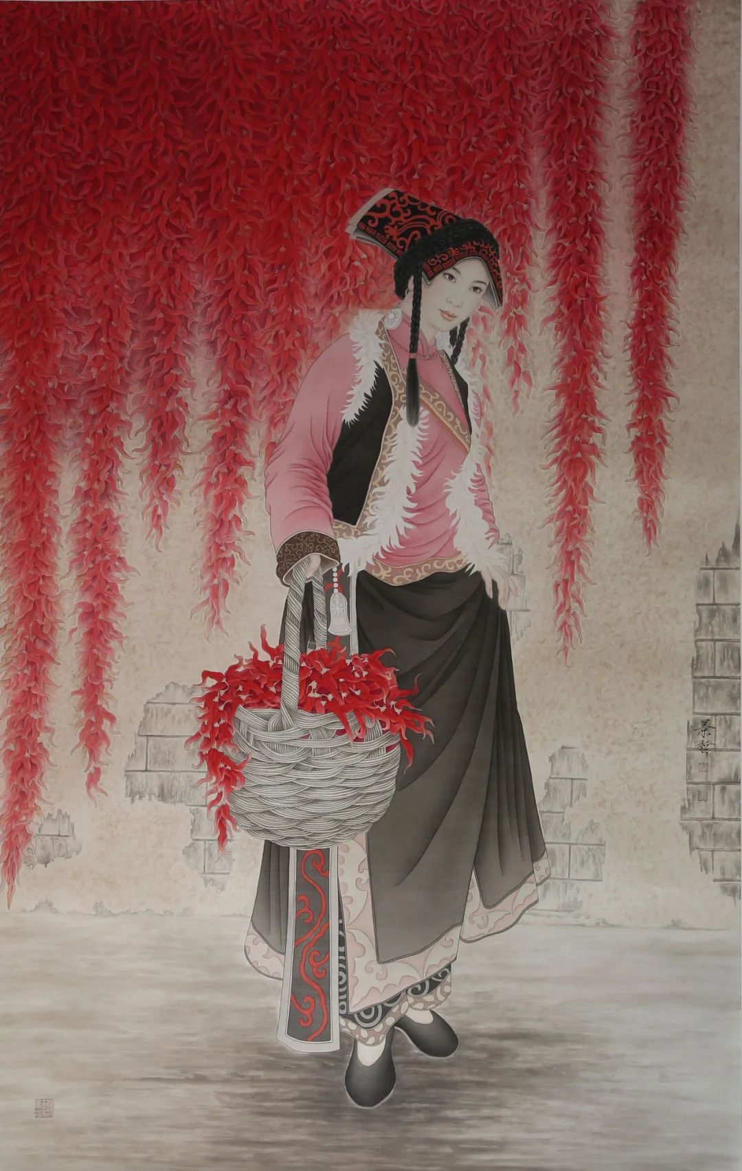 崔景哲以“中国红”为吉祥基调的作品,像《红妆》《新娘》《秀姑》等都是颇具特色的佳作,在这些作品中,人物的衣饰都以大红为主,配以多彩的民族纹样,像双喜、蝴蝶、凤纹、牡丹等,用以点缀人物内心世界的变化,既衬托了主体,又喻意出美好与幸福的期待,很是亲切喜人!