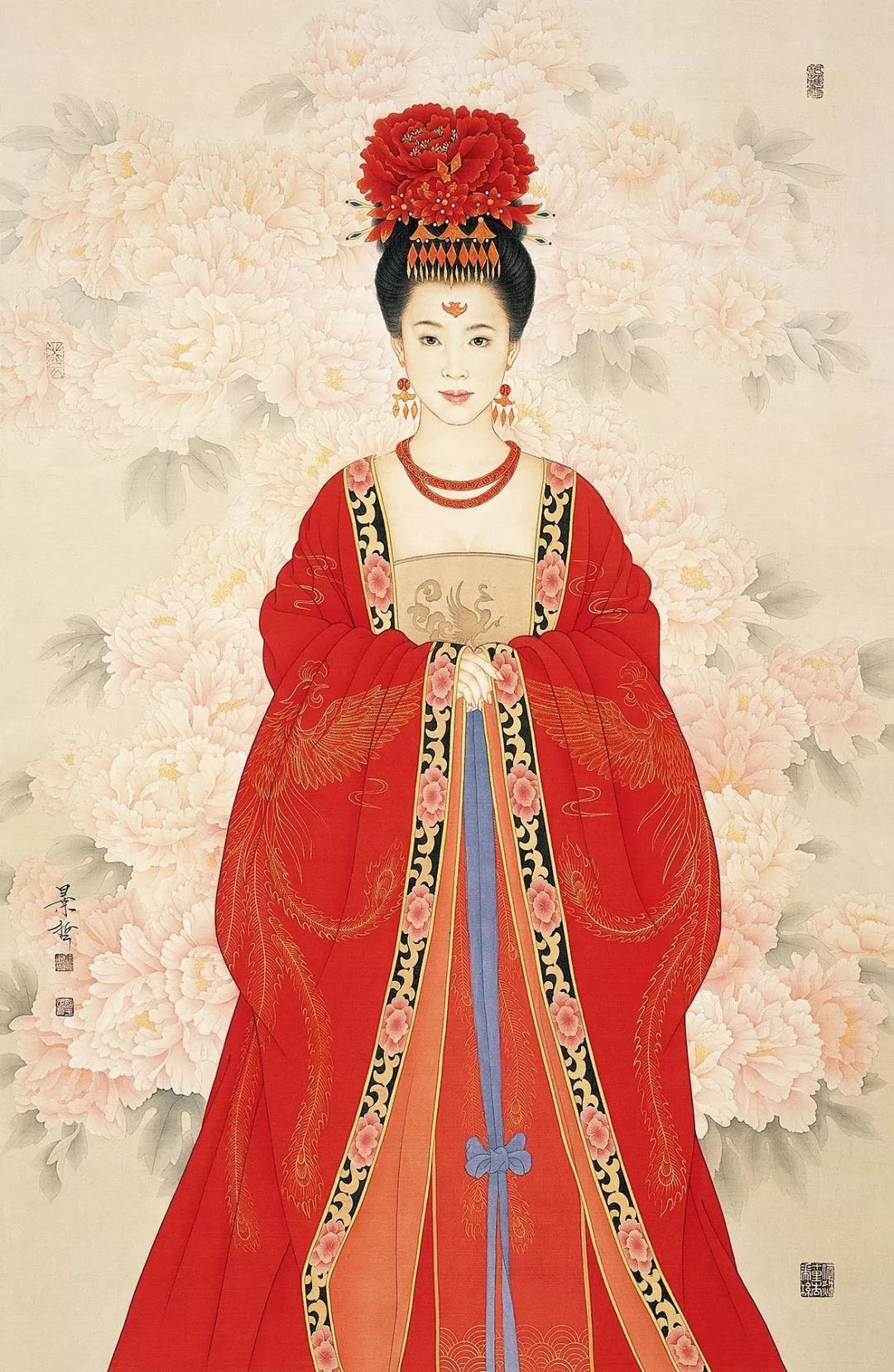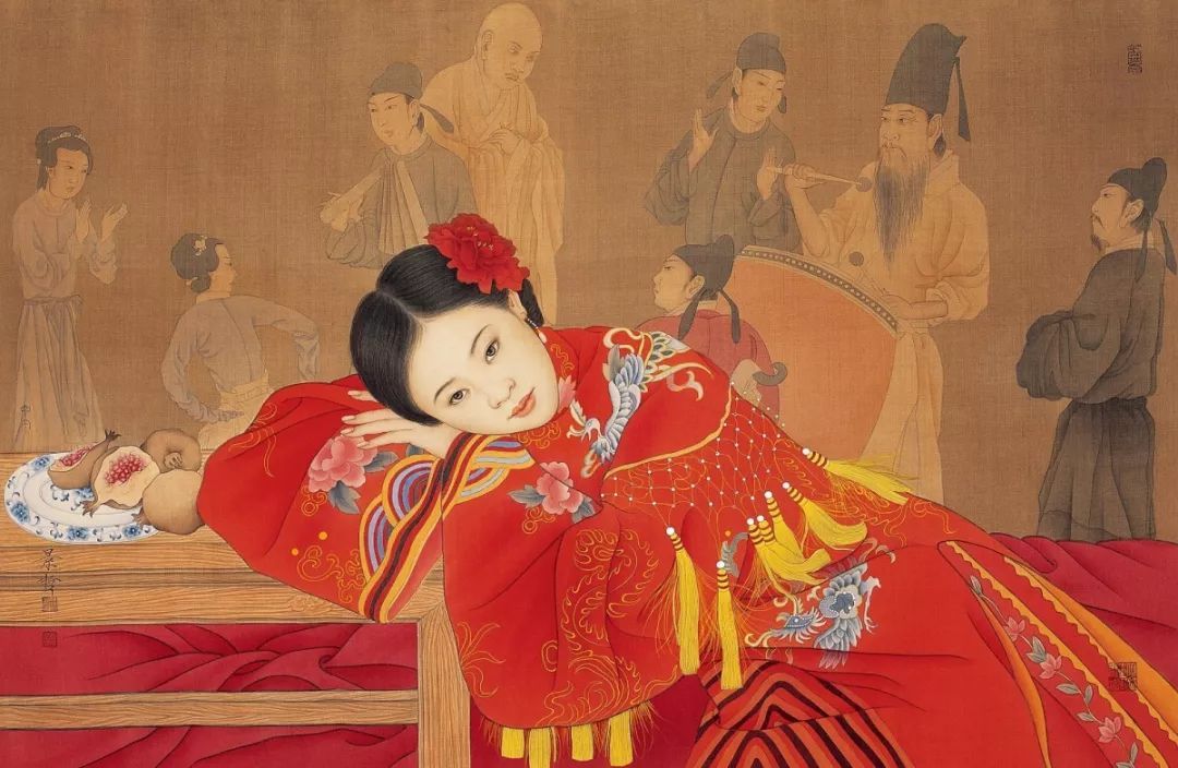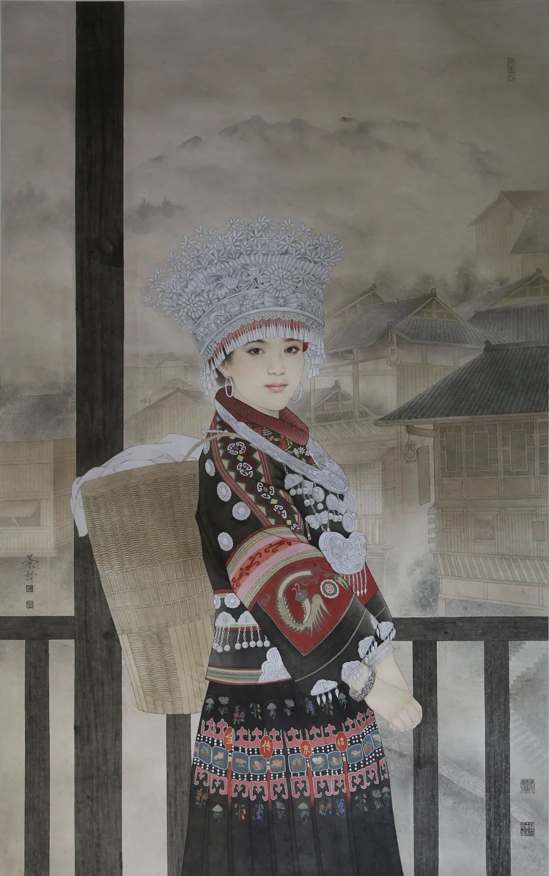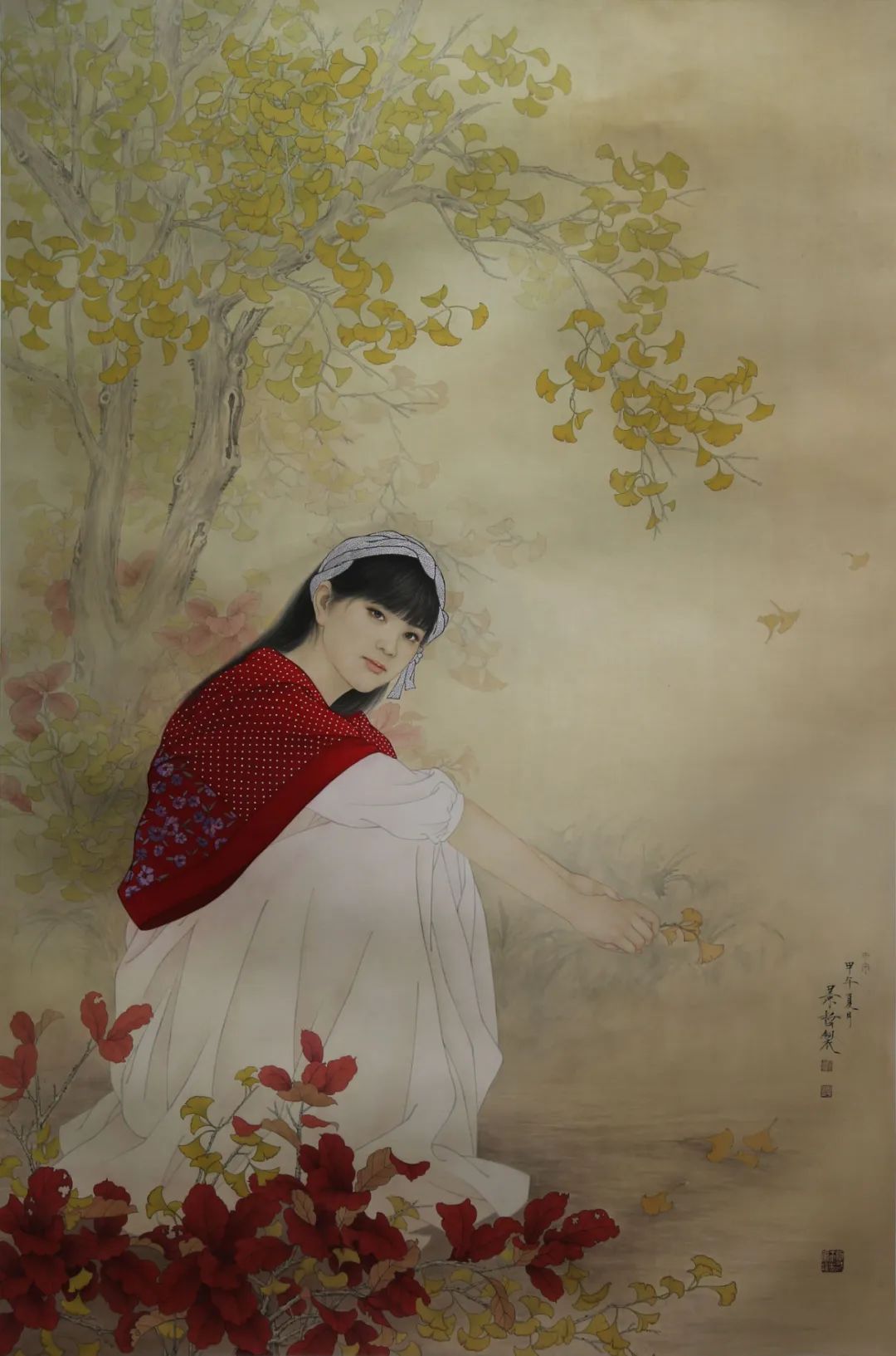 崔景哲以“中国红”为吉祥基调的作品,像《红妆》《新娘》《秀姑》等都是颇具特色的佳作,在这些作品中,人物的衣饰都以大红为主,配以多彩的民族纹样,像双喜、蝴蝶、凤纹、牡丹等,用以点缀人物内心世界的变化,既衬托了主体,又喻意出美好与幸福的期待,很是亲切喜人!