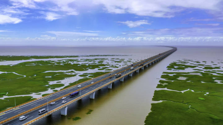 时近盛夏,浅蓝色天穹下的杭州湾波光粼粼,水汽氤氲。跨海大桥如同一条巨龙横亘在水面上。