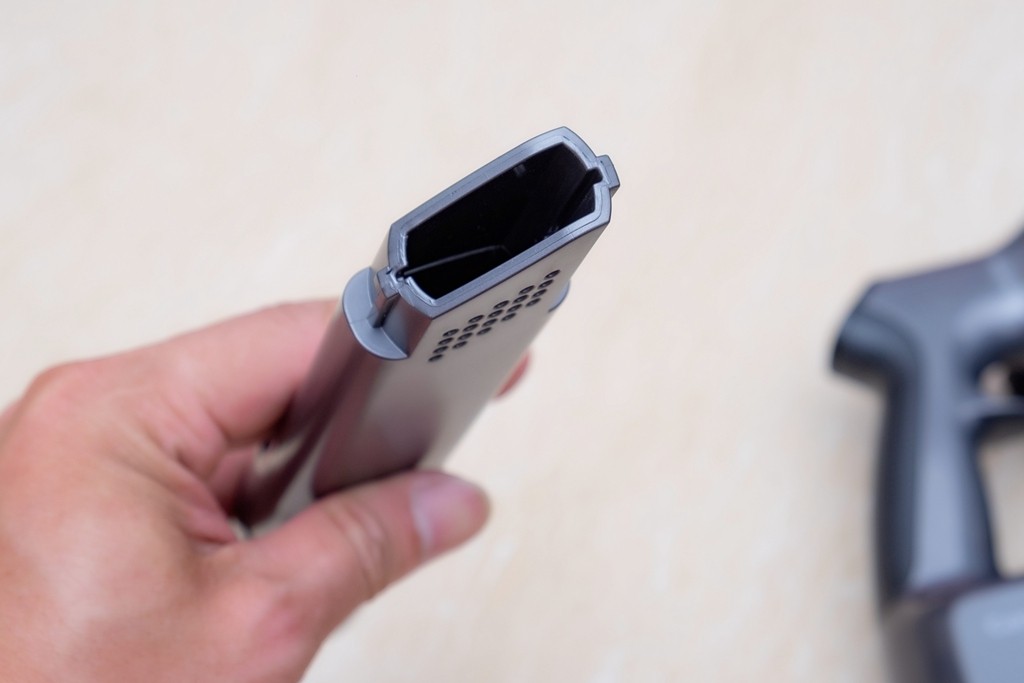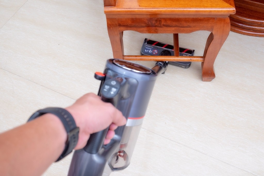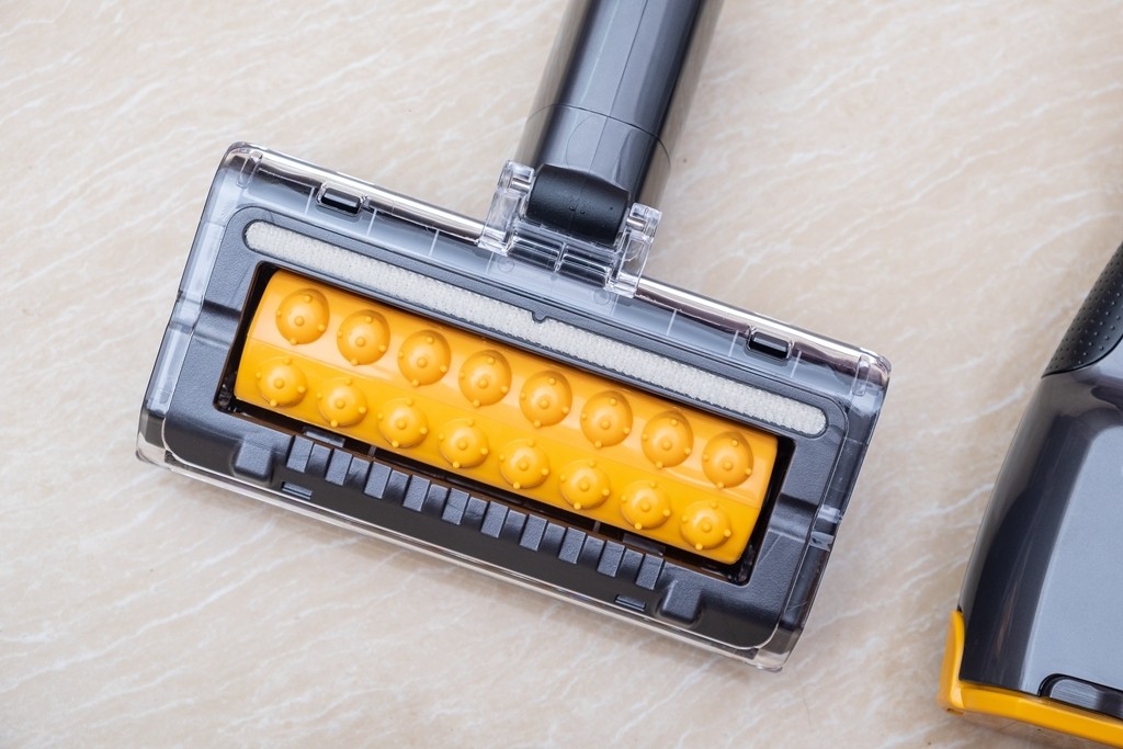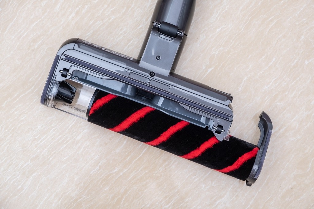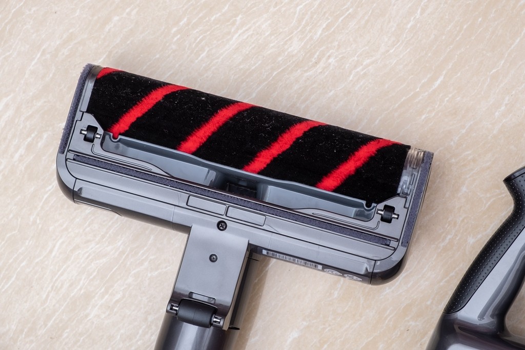 在测试清洁上,可以看出在用轻薄地板吸头可以轻松清洁一些桌椅底下,这些平时清洁起来非常麻烦,每次都要移动才可进行清洁,这次在尝试轻薄地板吸头后,轻松探入并进行清洁,非常的方便。除此之外,吸头的清洁也是简单,只需按下按钮,然后轻轻一拉即可拿出吸头滚轴,直接用清水冲洗晒干即可。