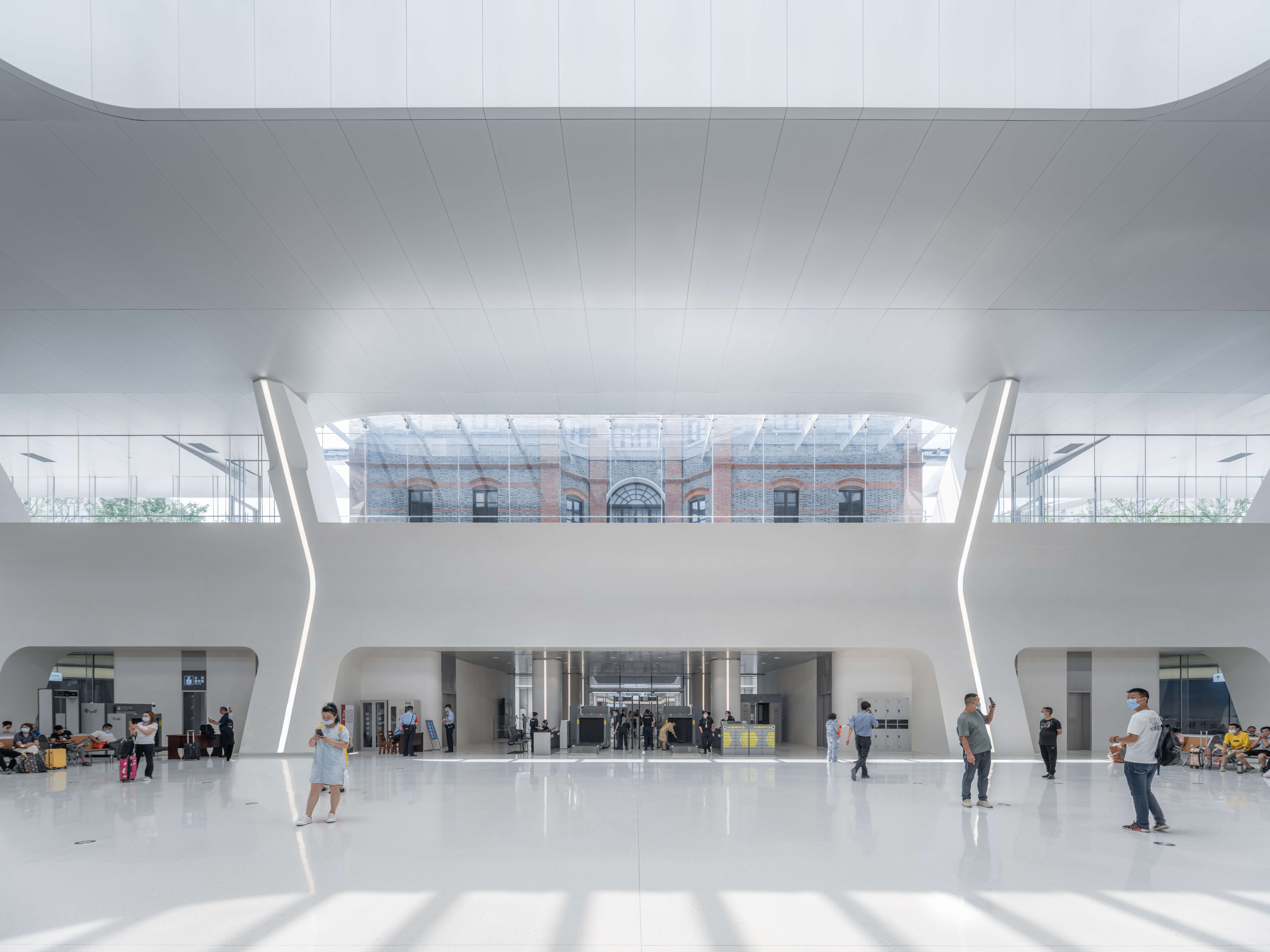 充沛的自然光通过大量天窗和一层玻璃幕墙往地下候车大厅倾泻,让室内空间开阔明朗。旅客在候车厅内,抬头即可见地面的复建站房仍保留着百年前的历史风貌,新与旧在这里相遇,时空的张力让空间层次更加丰富。