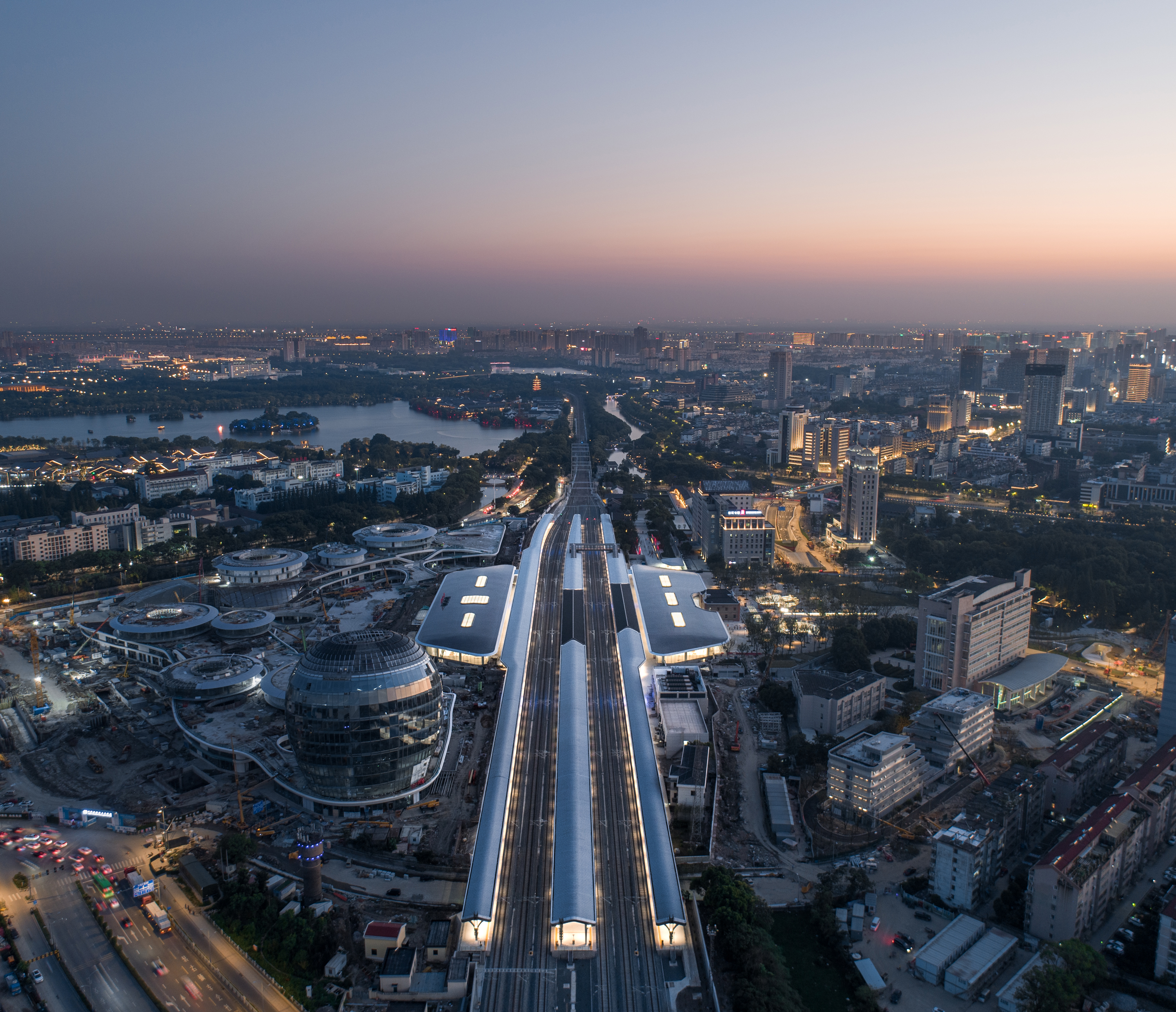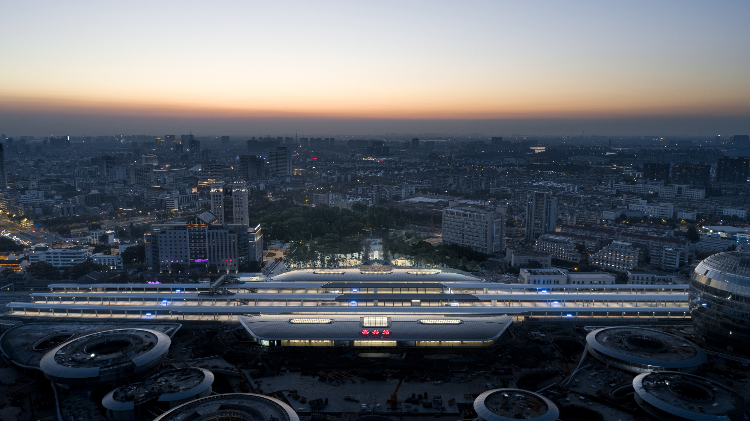 嘉兴火车站及南湖城市鸟瞰。摄影:CreatAR Images