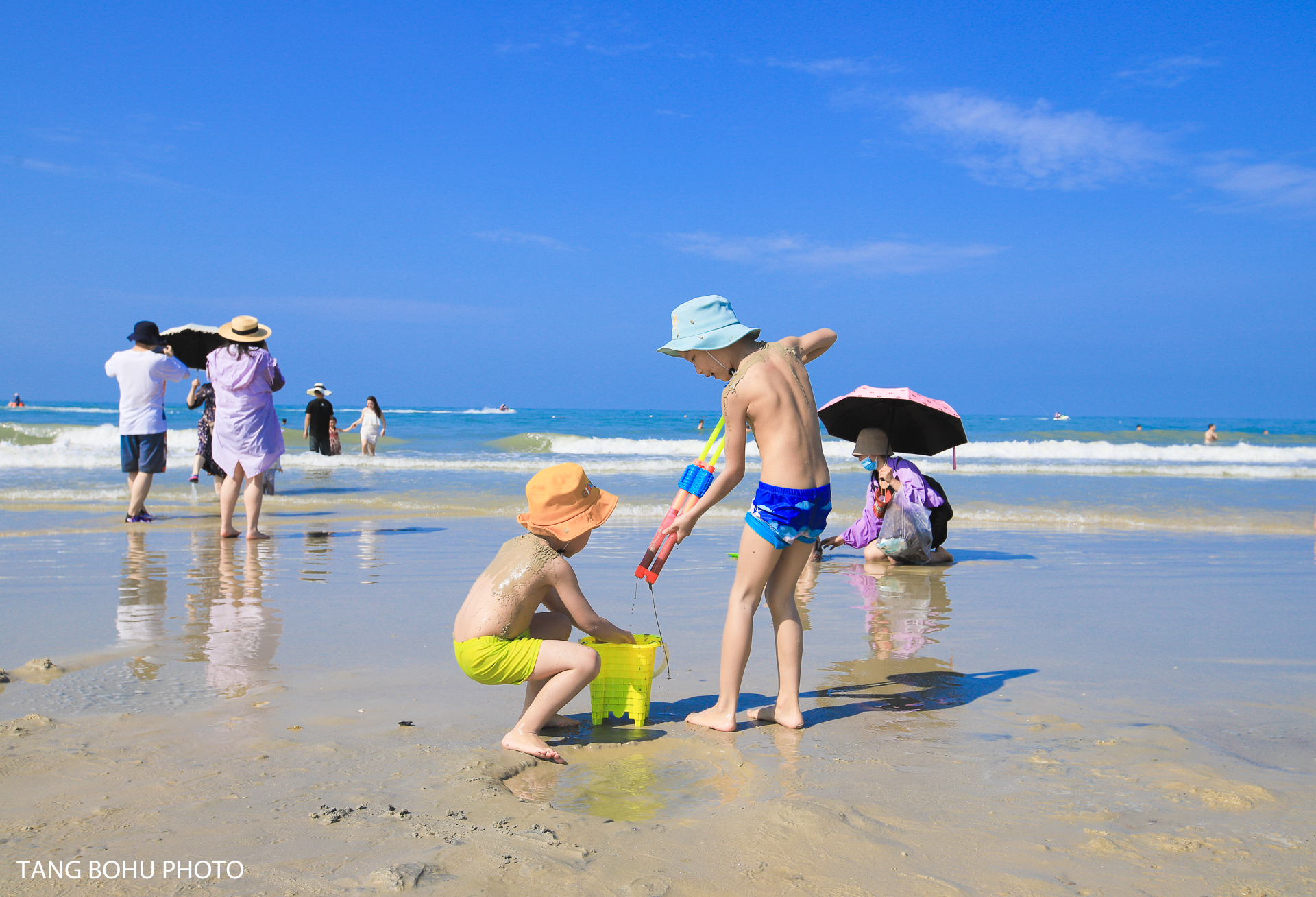 一早就来到了北海银滩,这里的海水很蓝,浪不是很大,关键是沙子很细,很适合游泳的地方,在海边看到了好多家长带着小朋友前来玩沙子的,小朋友们很开心地玩着沙子,尽情享受着夏天海边的乐趣。