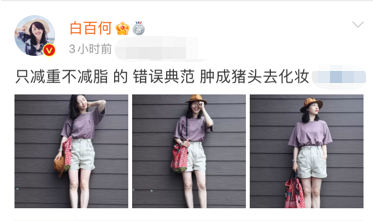 白百何在配文中说道:只减重不减脂的错误典范,肿成猪头去化妆。可见她也感觉自己已经是肉眼可见的发胖了,并对自己浮肿的脸部感到不满。不过轻松诙谐的自我调侃反而使长胖这件令人苦恼的事变得欢乐,白百何平时的语言艺术可见一斑。