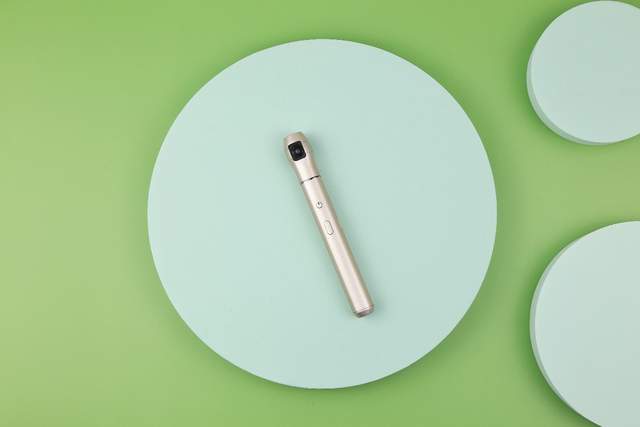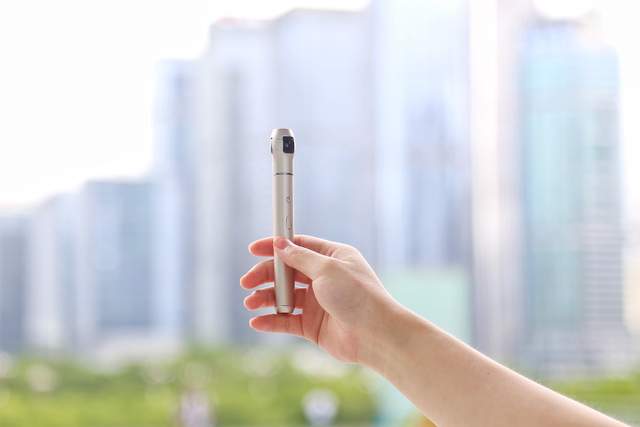 先来看看外观,怡可拍360°全景相机采用笔型外观设计,很纤细很小巧,金属材质的机身,重量却仅为60g,非常方便随身携带,想拍照时,随手拿出来一按即可。