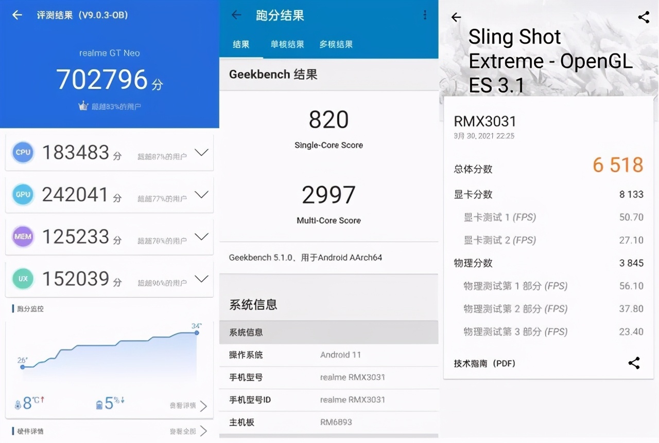 作为2000元价位的“搅局者”,realme真我的每款机型在每个价位都极具特色,realm真我GT Neo则开启了2000元价位的“新放肆”。核心配置上采用了联发科天玑1200旗舰芯片,具备满血版5G配置,VoNR、双5G、双载波聚合全齐。另外搭配UFS 3.1闪存以及LPDDR 4x内存,安兔兔整机跑分高达70万+,另外还加入了钢化VC液冷散热,可以hold得住长时间的拷机体验,让整机的逼格提升了不少。