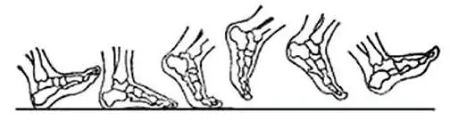 先足跟着地,然后是脚的侧面,最后是大脚趾