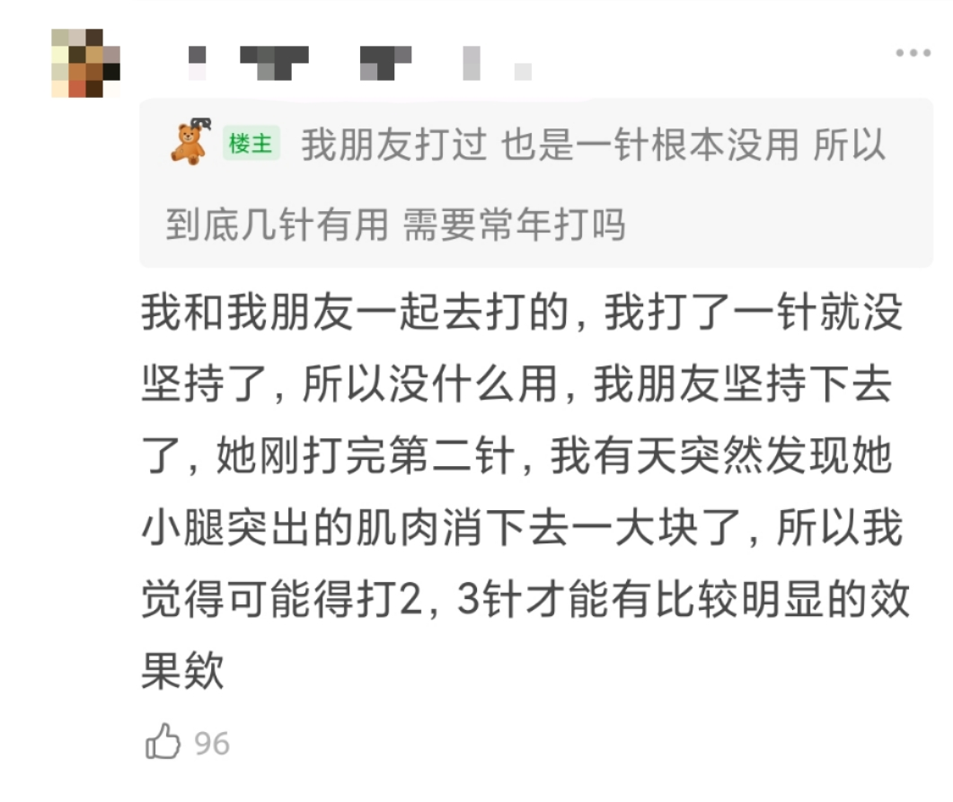 对应的高科技是瘦腿针和前段时间火起来的小腿肌肉阻断术。两种方法对比,瘦腿针要安全得多,不过瘦腿针并不是一劳永逸的事,想要永远保持芊芊玉腿,大概率每年都得给瘦腿针送钱……