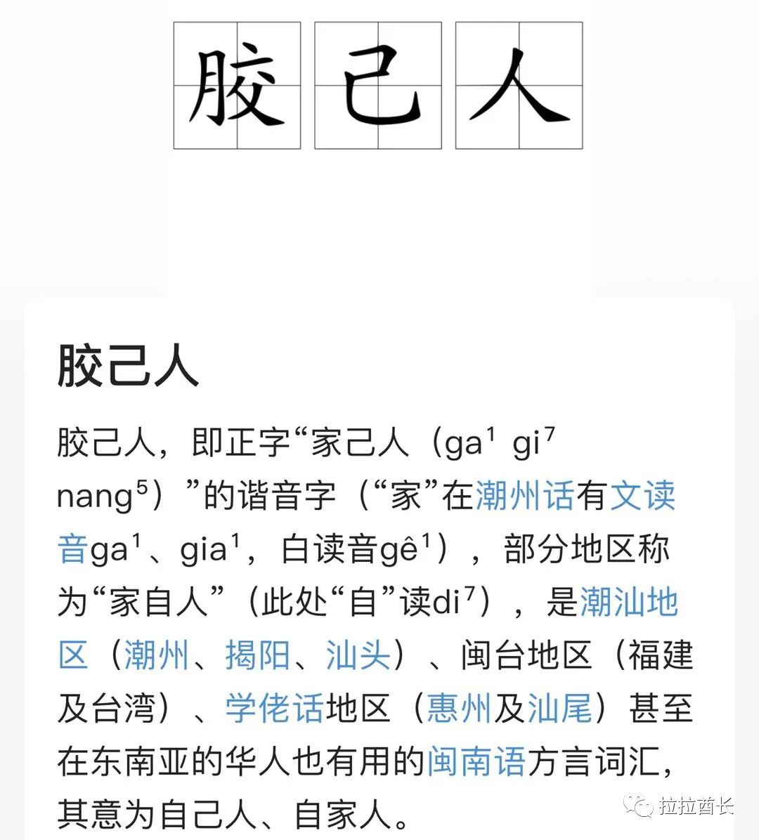 上面所说的一些内容其实也是酋长我才疏学浅习惯性跑题的一种表现,既然是曾经答应过人家的事情,那怕是多么的困难,也是要硬着头皮地往上冲的,谁让我们都是“胶己人”呢?因此今天的我们大家也就从潮汕方言中的“胶已人”一语来说起。