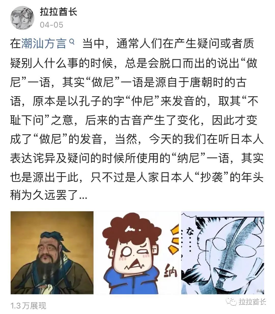 这其实也就涉及到了一个极为有趣的问题,首先我们大家都应该懂的:“尼”做为一个古音,也并不止是仅存在于潮汕方言中,当“尼”与“做”两者相连起来的时候,这其实也就直接地将“做尼”一语的发音及其是为疑问语而相连在了一起,如果我们再想一想古代的读书人在向人谦虚请教的时候,一躬到底然后再文绉绉且酸溜溜的说上一句:“某愿效仲尼之不耻下问而请教阁下…”这其实也就意味着潮汕方言中的“做尼”一语很有可能是经由“仲尼之不耻下问”而演化而来,古人说的“半部《论语》治天下”凭的不就是“不耻下问”吗?值得我们注意的是现在的日本人在表达疑问及诧异时也是使用了“纳尼”一语,估计这也是从前的日本人自唐宋时期所偷学过去的,虽说至今巳经是发音不够标准了…