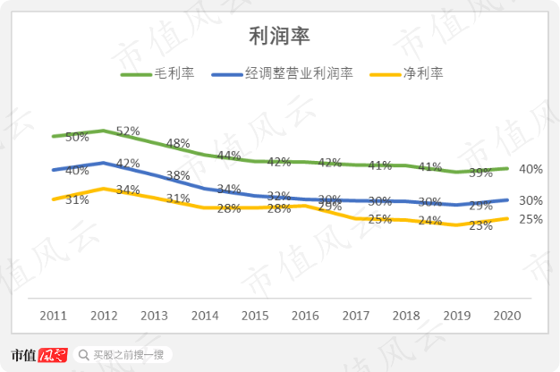 公司毛利率自2011年以来主要呈下降趋势,从2012年最高时的52%降至2020年的40%,自2015年以来倒是比较稳定。