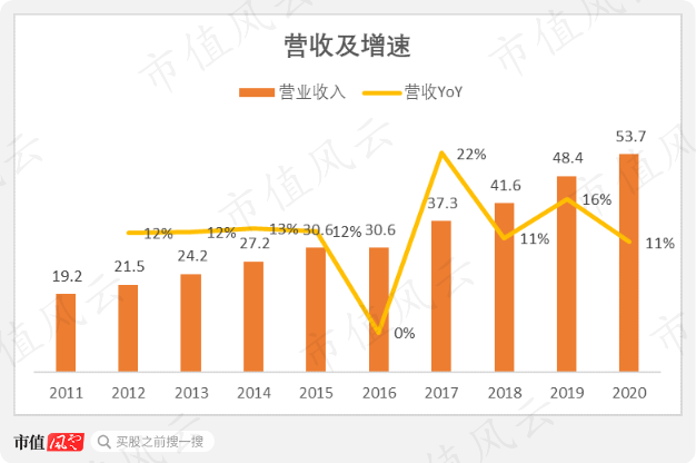 2020年,公司营收53.7亿,同比增长11%,自2011年以来的CAGR为12%,从历年增长数据也可以看到,公司多数年份的增速也都在12%附近,极为稳健。