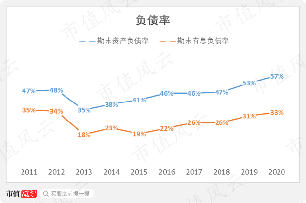 公司2020年末的资产负债率为57%,是近年来最高的。有息负债率也大致同步,近年来处于上升趋势,2020年末为33%。