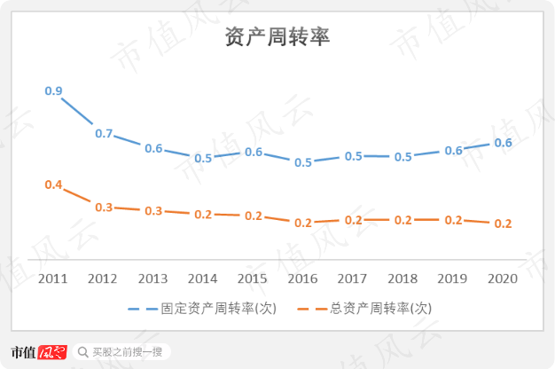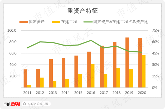 公司的固定资产规模较大,属于明显的重资产行业,2020年末固定资产和在建工程占总资产比高达47%。
