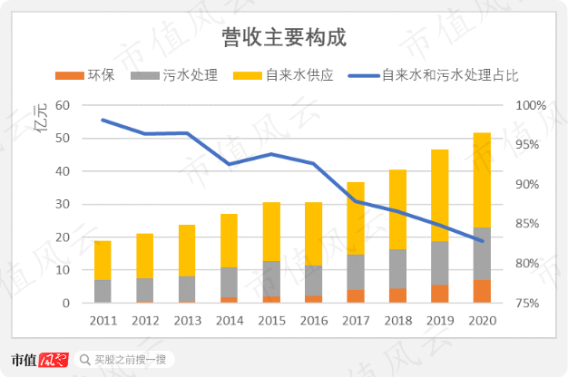 历年营收构成中,自来水供应业务始终是公司的第一大业务,2020年营收占比53%,污水处理其次,占比29%,前两项合计83%。环保业务占比13%,也是增速最快的业务。