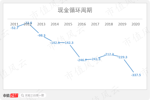 回到之前对行业理解的问题,假如我们按照制造业企业常用的“购存销”来分析,以现金循环周期为指标,可以看出,不仅一直为负,而且还一路拉长到2020年的几乎11个月,闻所未闻。