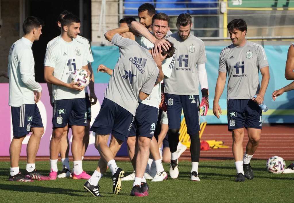 西班牙国家队备战训练 有人将队友头当皮球一把抱住