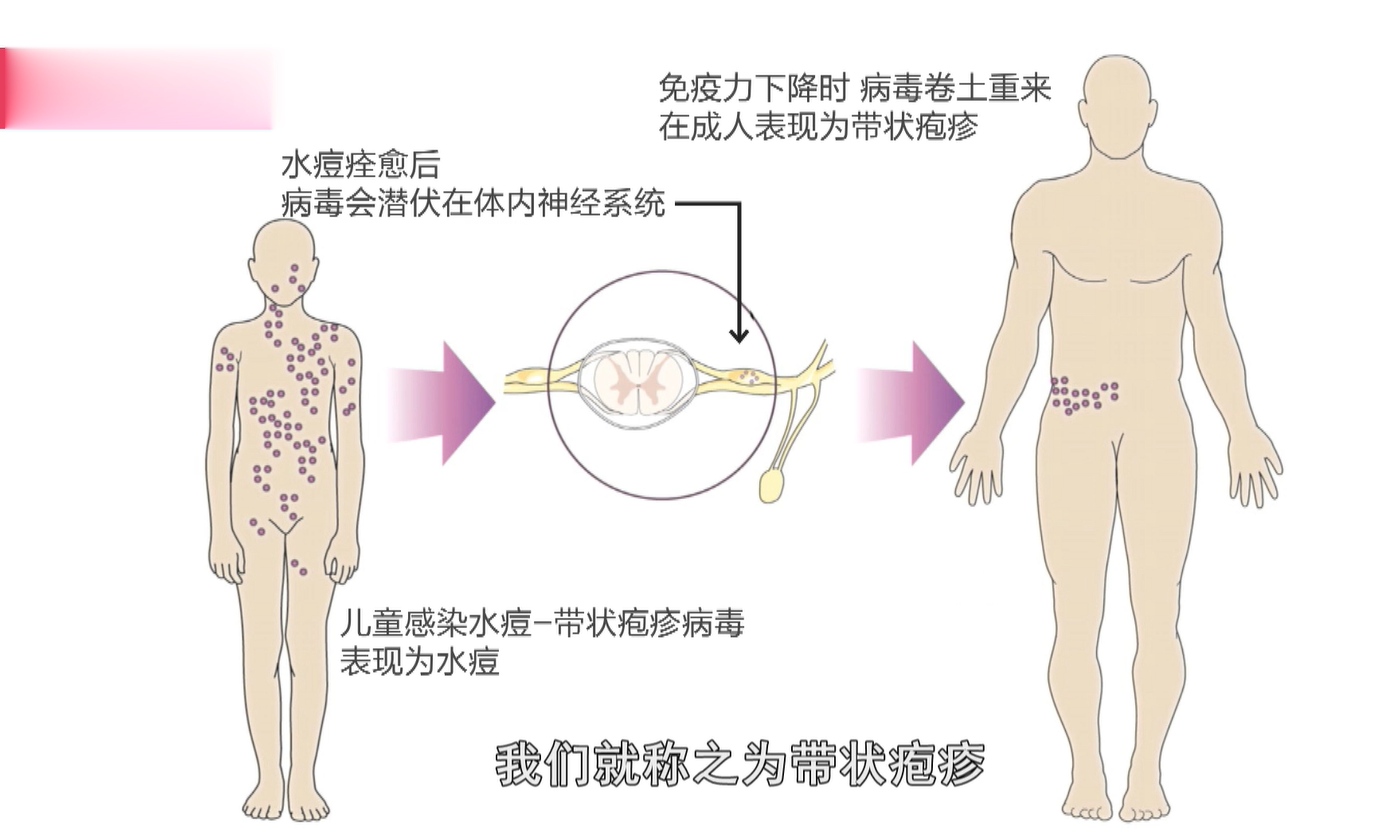 为了更为清楚地表述这个问题,这里面给大家带来一张示意图,带状疱疹的病原体,我们称之为水痘带状疱疹病毒,也就是在儿童触发感染的时候,它表现的是水痘,但是50岁以上的老年人,通常会表现出一个二次感染,导致病毒再激活的疾病,我们就称之为带状疱疹。
