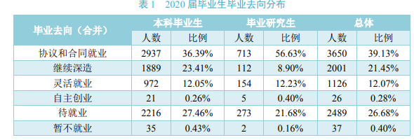 2020届毕业生就业主要是以协议和合同就业为主,本科生占比36.39%,研究生占比56.63%,继续深造人数中,本科生占比23.41%,研究生占比8.9%;虽然本科生就业率不高,但是据统计,待就业人数中有一半以上是在拟升学中。