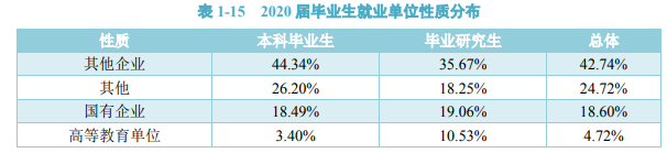 就业单位主要是以其他企业为主,本科生占比高达44.34%,研究生占比35.67%,国有企业人数也有不少,本科生占比18.49%,研究生占比19.06%;不过在就业地区上,不管是本科生还是研究生,就业都是流向省外的多,占比都在60%以上。