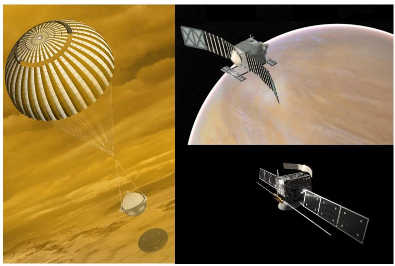 上图为三个探测器的概念图。左侧为DAVINCI+,右上为VERITAS,右下为EnVision。 图源:NASA/ESA