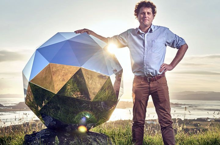 上图即为彼得贝克和他提出的“人类卫星”合照,该设计像极了迪斯科厅的彩灯。图源:Wikipedia