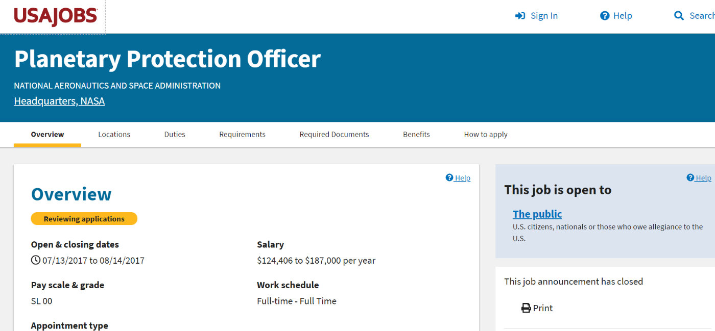 上图为NASA/OSMA(安全与任务保障部门)提供的“行星保卫官”职位,有一定的专业要求和身份要求。图源:USAJOBS
