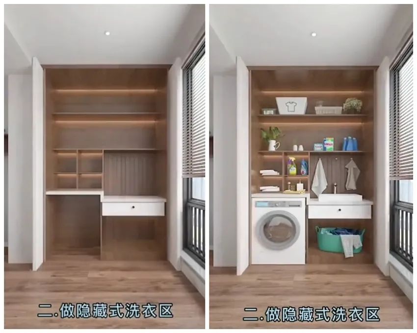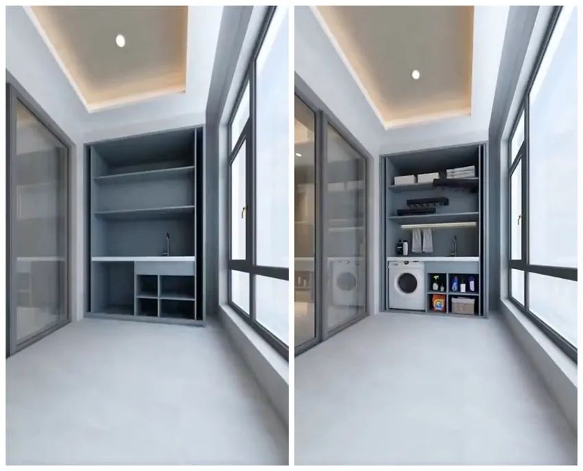而后,在阳台的一侧做上隐藏式洗衣区,通过顶天立地式的组合柜,将洗衣机、洗手台,以及各种洗衣剂设置在这一侧的角落里,这样一来,阳台就拥有了洗衣的功能。