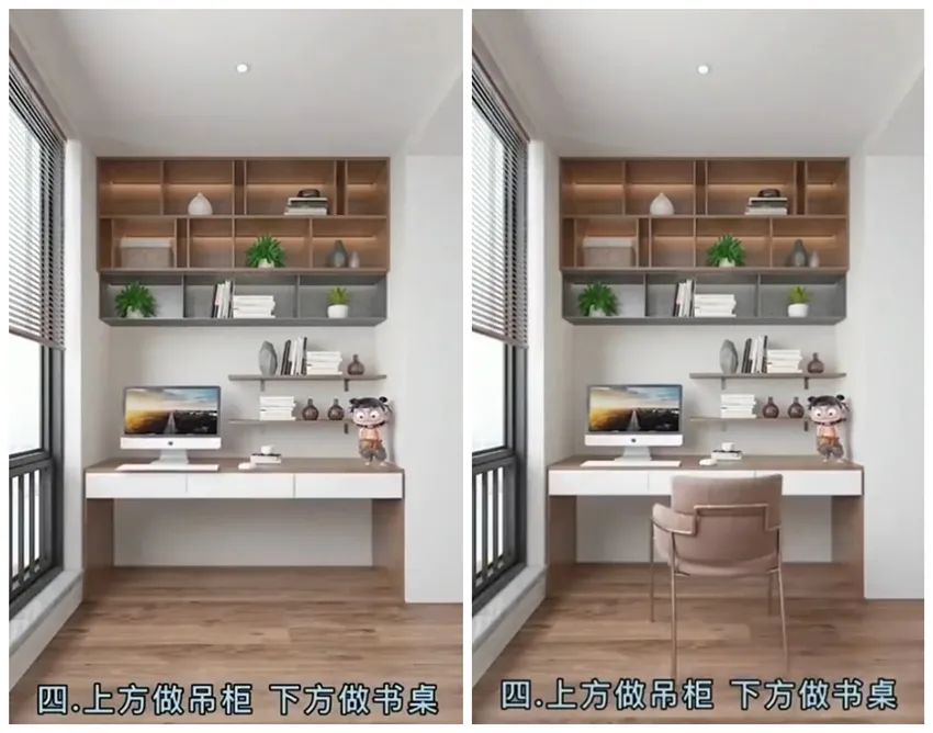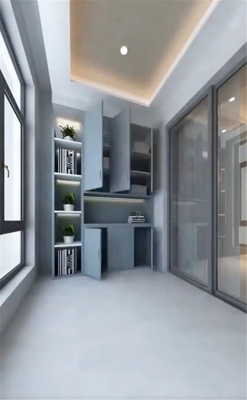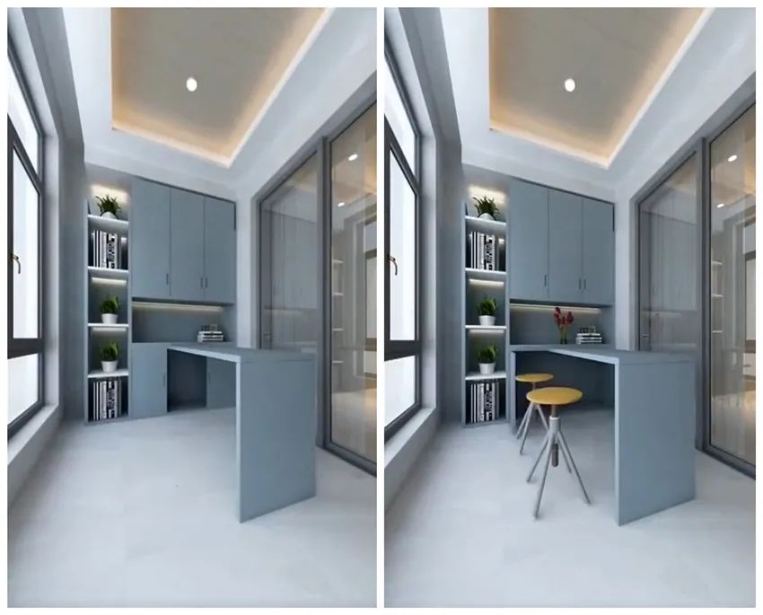 而阳台的另一侧,可以在上面做吊柜,下面做出书桌,小小的空间秒变工作间,对于没有书房或者工作区不够的家来说,这样设计非常实用。