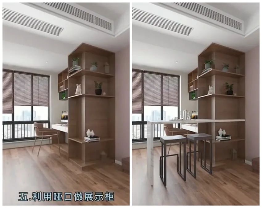 当然,另一侧的垭口也不要浪费,做出环绕式的柜子,可以摆放摆件或收纳其他的日常杂物,再和柜子组合制作小吧台,将阳台的区域融入客厅,这样我们就能得到一处兼具工作、娱乐、功能性的开放式阳台了!