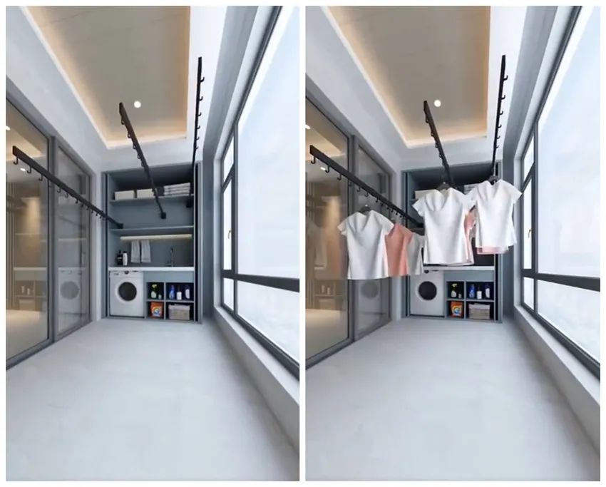 接下来,在柜内上层的位置加入折叠式的晾衣杆,每次洗完衣服后就伸出晾衣杆挂晾衣物,使用完毕后再收入柜中,完全不会让阳台显得乱糟糟的~