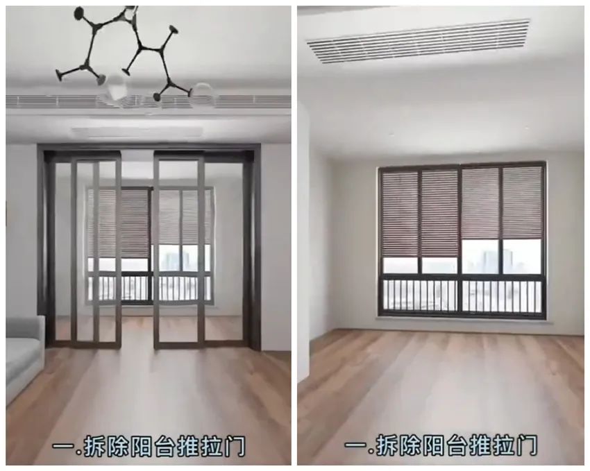 首先,我们可以解除传统隔断式阳台的设计,将阳台和客厅的推拉门取消,以创造更宽敞的空间,解决阳台狭小逼仄的问题。
