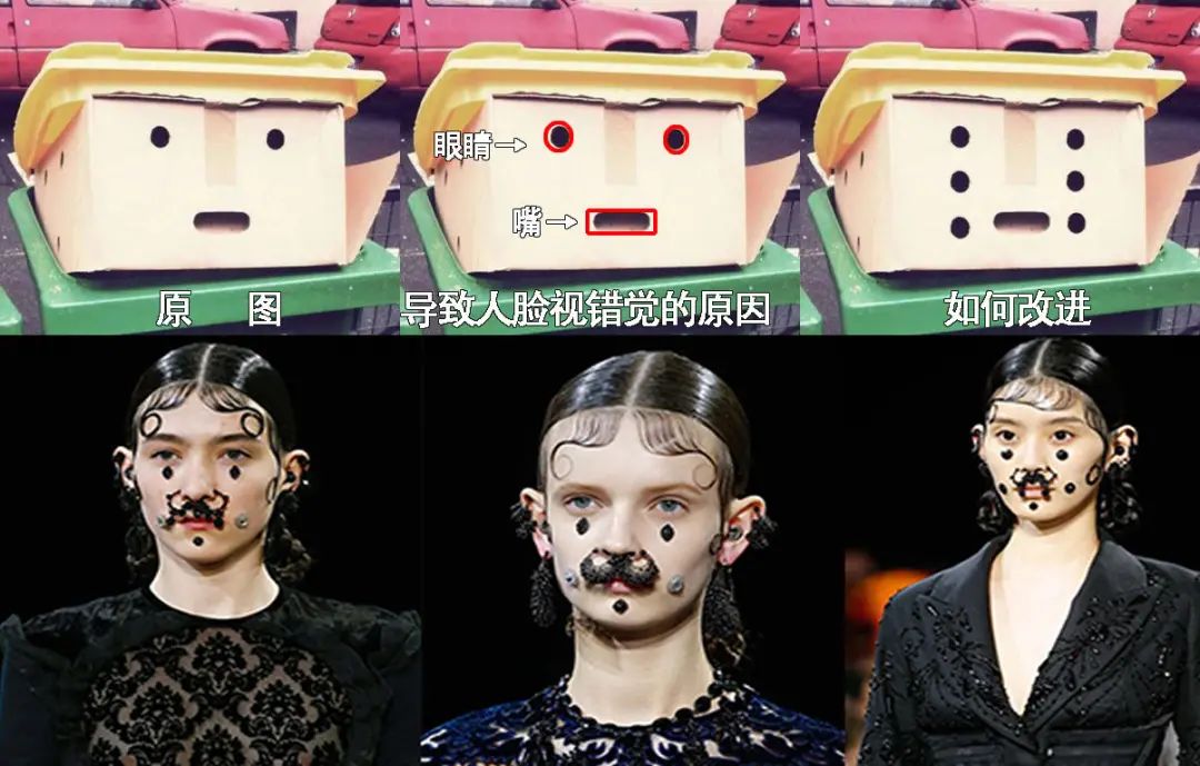 根据圆点就是眼睛的“人脸视错觉”原理,设计师可以在模特脸上 添加黑眼珠大小的黑点,并用特殊装饰把模特的鼻子和嘴“连接”,达到打破面部特征的目的。