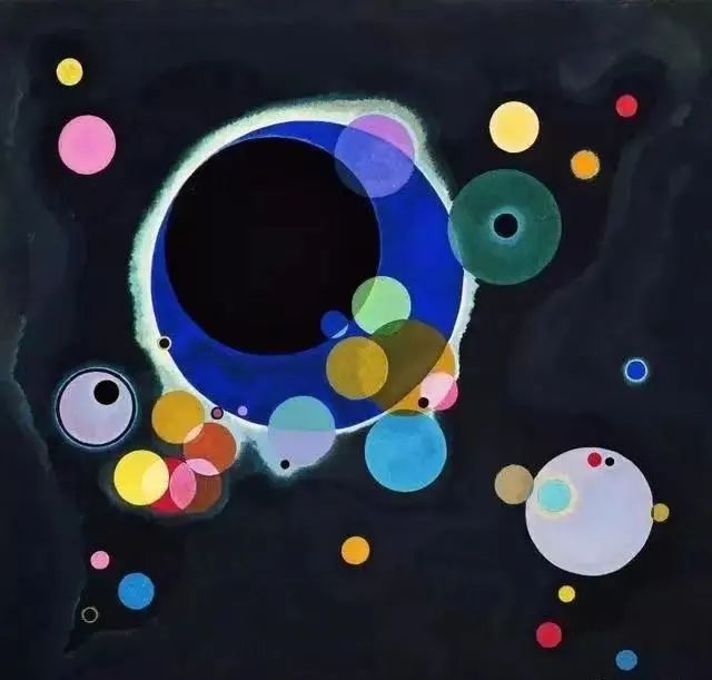 也好像我们置身于一个圆形的宇宙,一个个圆形的星球在每一个轨道上,这种超出了自然的宇宙哲学也是康定斯基所想表达的理念之一,然而我们在观看他的作品中更多的是发散思维以及去感受他所为我们营造的一个未知的世界。