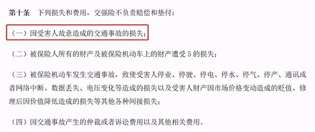 因受害人故意造成的交通事故的损失,交强险不负责赔偿和垫付。